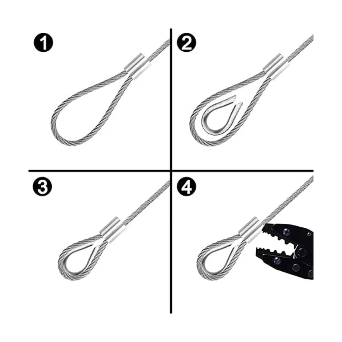 Material: el cable de alambre y el dedal están hechos de acero inoxidable 304 que tiene una resistencia superior a la corrosión y la excelente resistencia a la oxidación en entornos malos. Manguito de aluminio para crimpado hecho de aluminio de calidad.