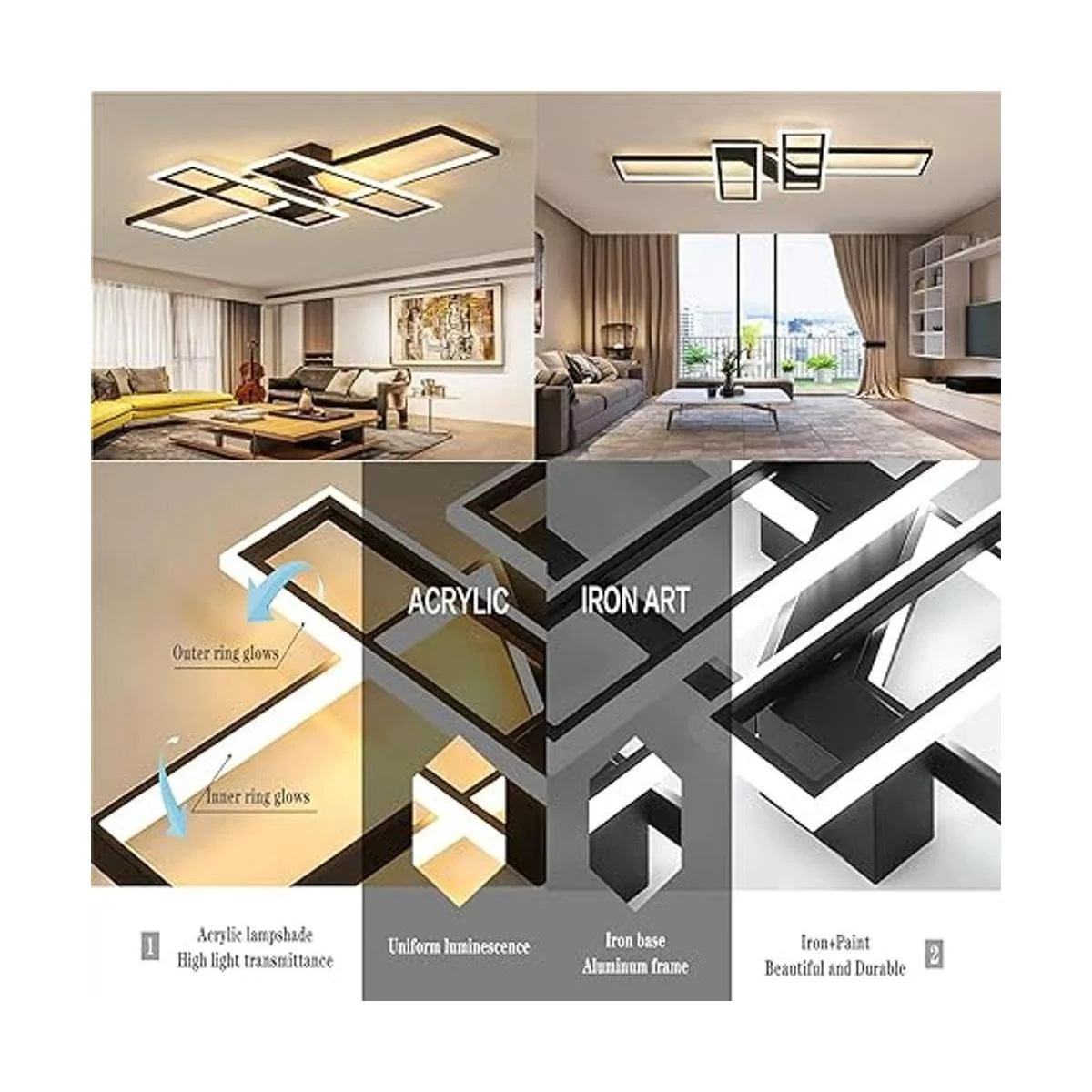 Alta calidad y duradero Las lamparas de techo modernas están hechas de silicona de alta calidad, acrílico y marco de aluminio, resistente a la corrosión, resistente a la decoloración, resistente a los arañazos, fácil de limpiar, reduce el número de reemplazos de lámpara y tiene una vida útil de hasta 50.000 horas, ahorrando mucho dinero y tiempo.