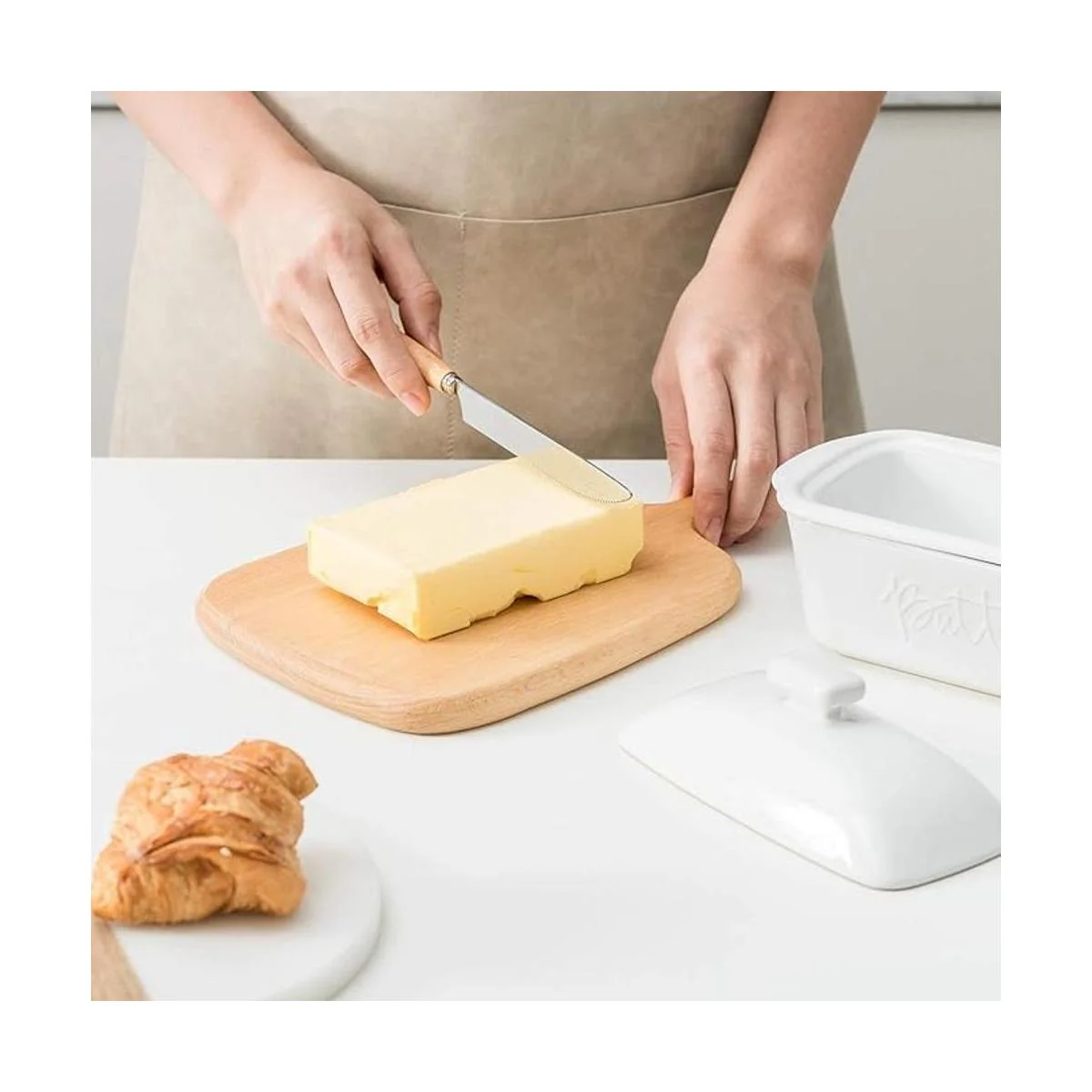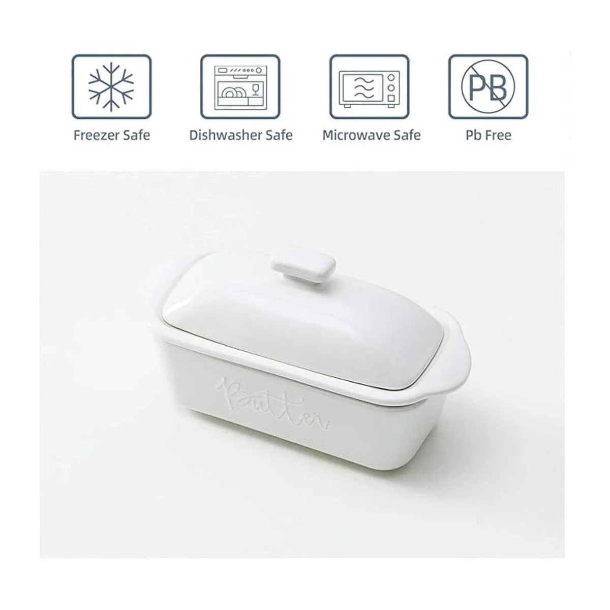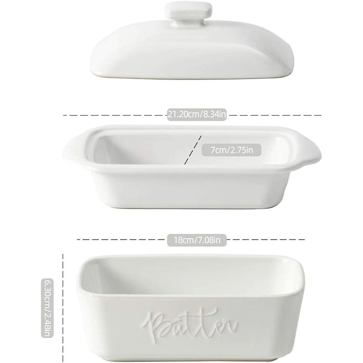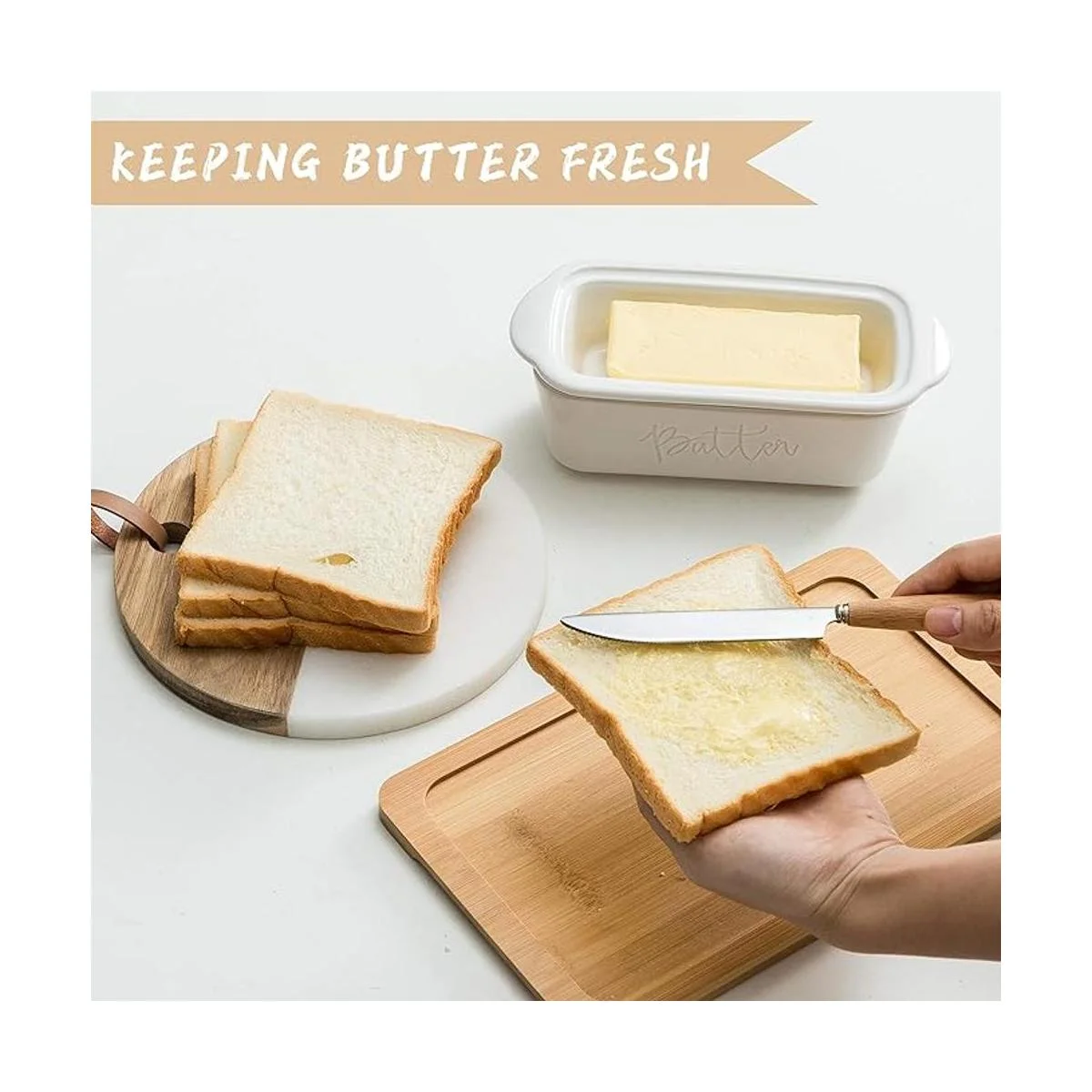 FE Mantequilla de cerámica de 10 onzas con línea de agua, plato de mantequilla francés con tapa para encimera blanco