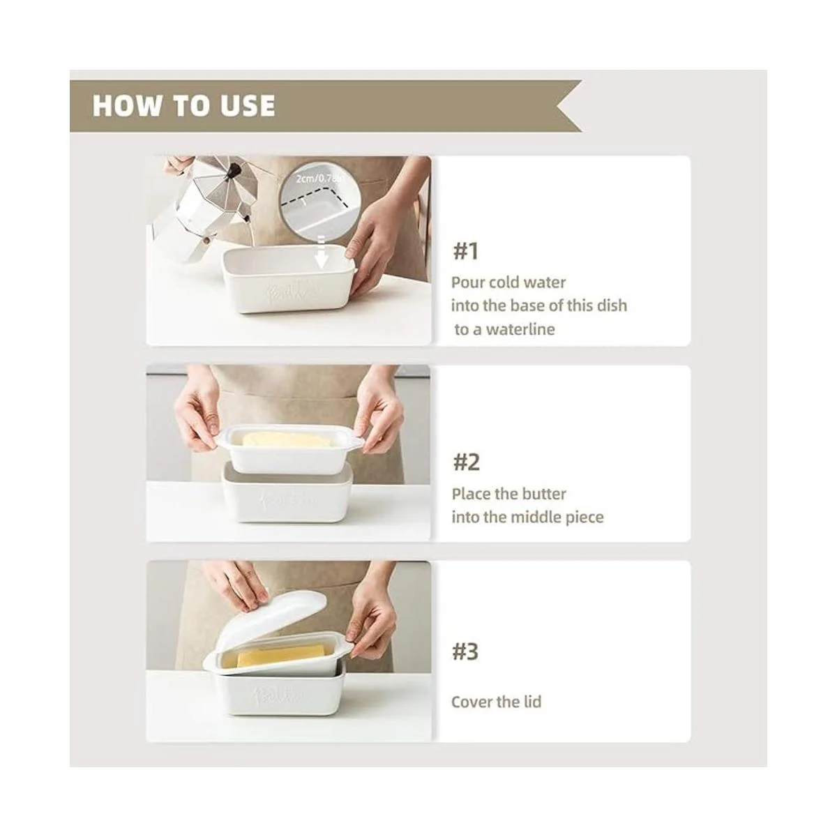 Diseño exquisito: el bote de mantequilla con depósito de agua es un juego de 3 piezas. Vierte agua en la parte inferior hasta la línea de agua, coloca tu palo de mantequilla en la pieza central, y la tapa con mango de elevación es la tercera pieza que se coloca cómodamente en el soporte de mantequilla. Cambia el agua cada día o cada 23 días, mantiene la mantequilla fresca durante 2 semanas