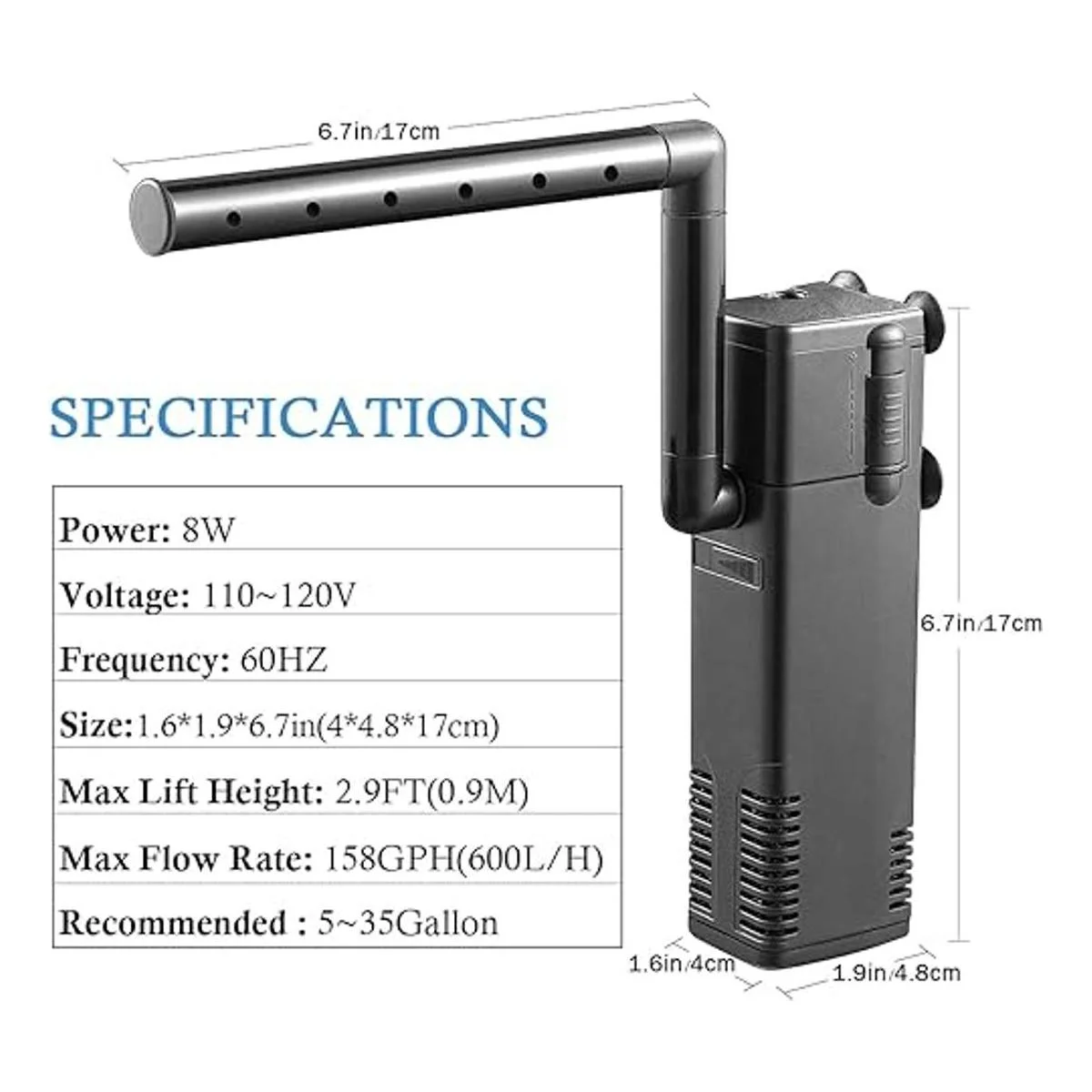 Potente filtro interno: caudal máximo: 160 GPH 600 l/h, dimensiones: 1.6 x 1.9 x 6.7 in, filtro de 8 vatios adecuado para peceras de 5 a 35 galones. El flujo de agua se puede ajustar de acuerdo a tus propias necesidades.