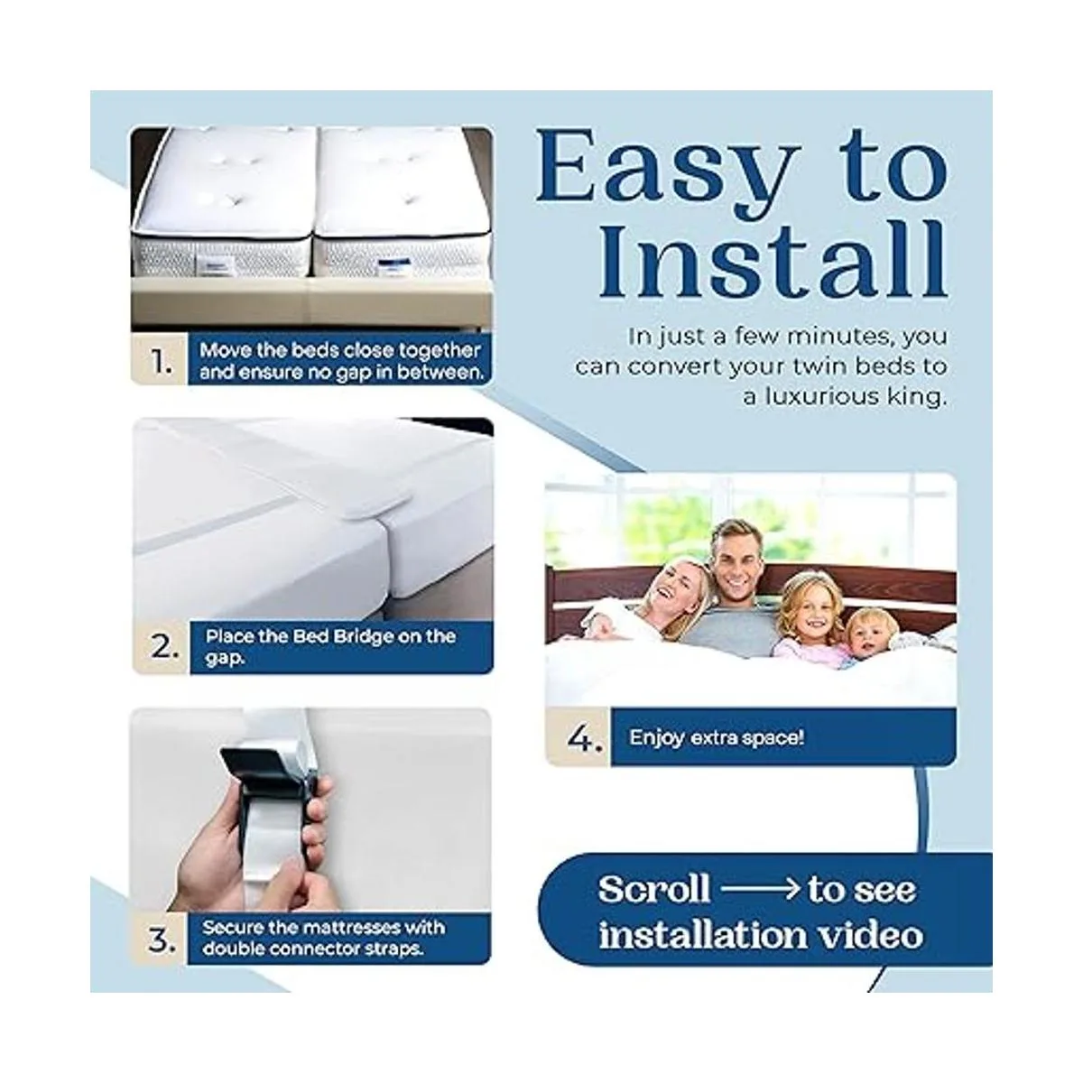 Fácil instalación: convierte el tamaño individual en King en unos sencillos pasos Mueve dos colchones juntos y deja un pequeño espacio en el medio. Coloca el puente de la cama entre las dos camas para llenar el hueco. Envuelve 2 juegos de correas alrededor de los colchones y asegúralos con hebilla ultra ancha
