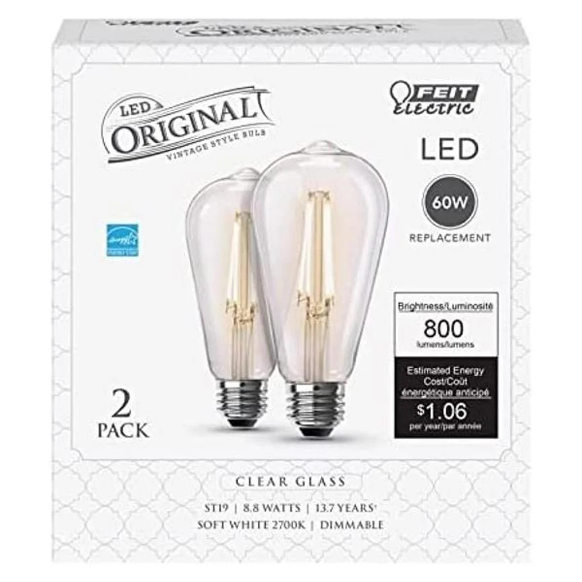 Feit Electric ST19 Bombilla LED de filamento E26 mediana, color blanco suave, equivalente a 60 W, paquete de 2 unidades, caja de 1
