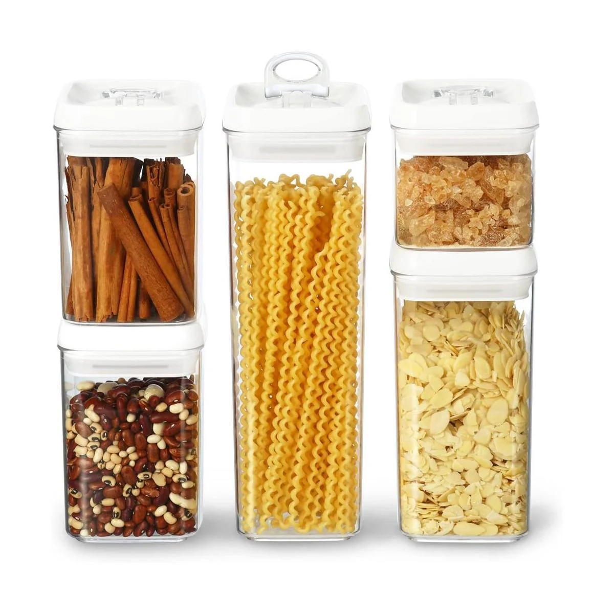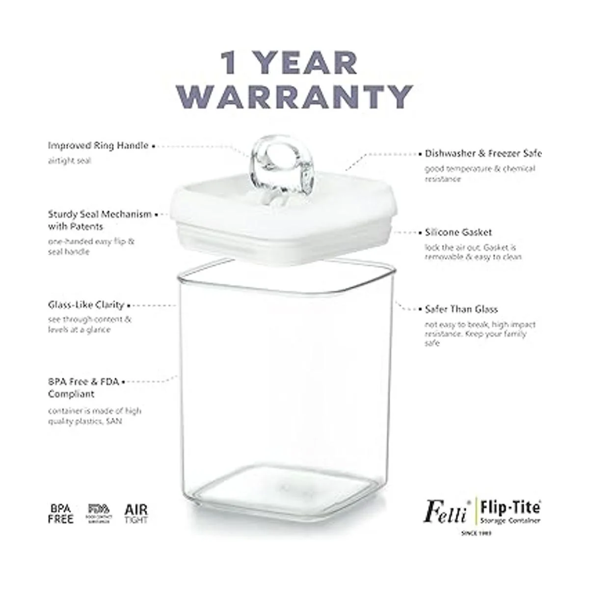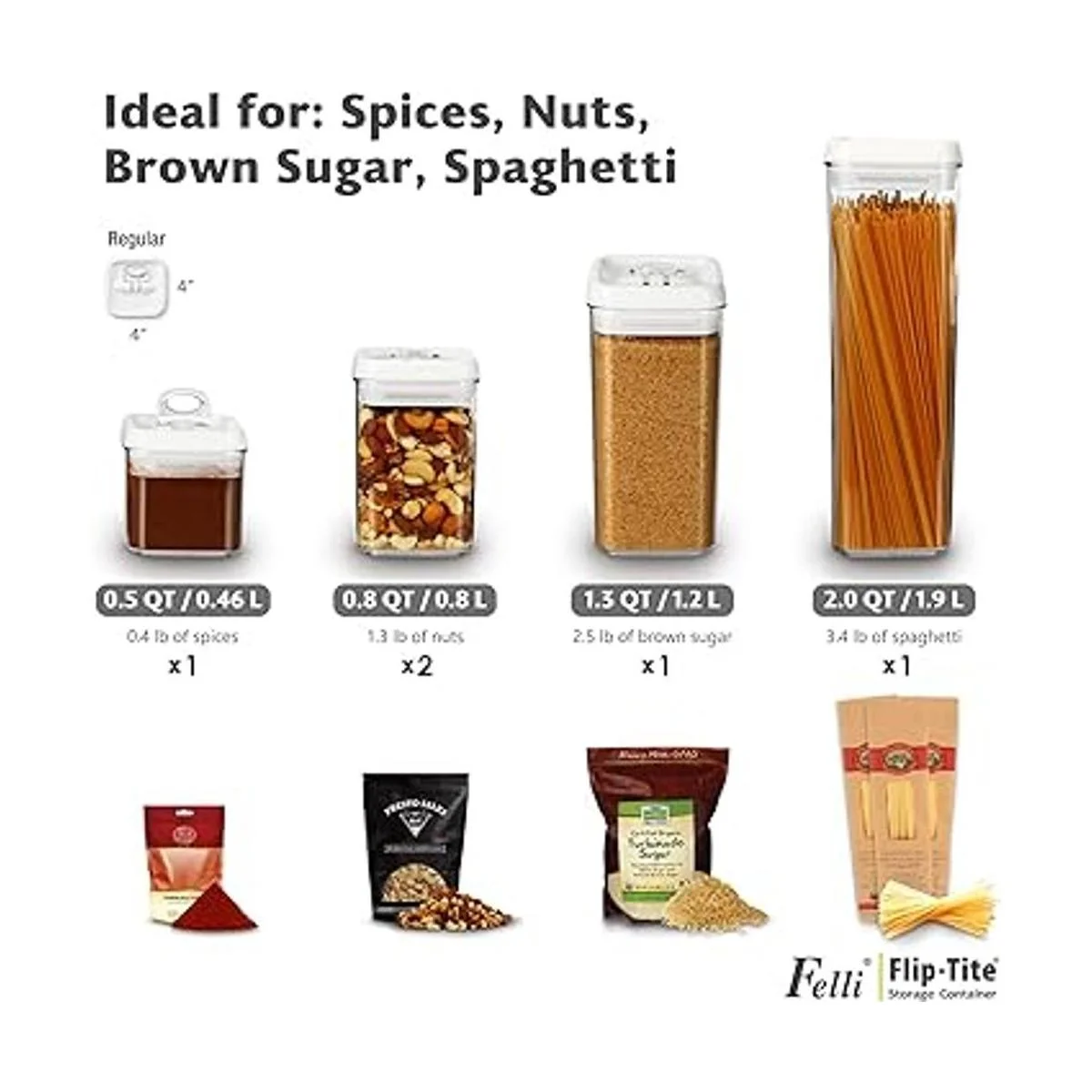 Felli Flip Tite Contenedor de almacenamiento de alimentos de 5 piezas, juego variado con tapas blancas, sello hermético, despensa, organizador de refrigerador, mostrador de cocina, recipiente, especias, aperitivos, pasta, dulces, regalos de inauguración de la casa para mujeres