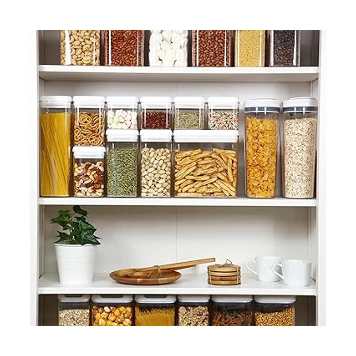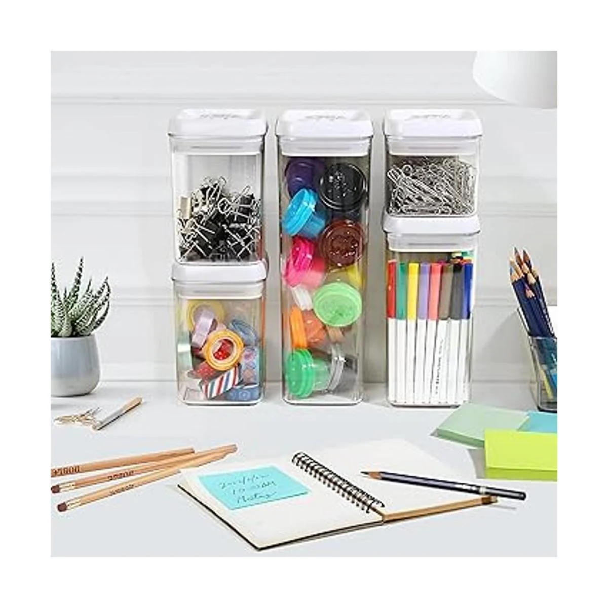 Juego de recipientes de 5 piezas para la vida diaria: 1 recipiente alto 2.0 cuartos de galón, 1 recipiente grande 1.3 cuartos de galón, 2 recipientes medianos 0.8 cuartos de galón, 1 recipiente pequeño 0.5 cuartos de galón, cada tamaño está perfectamente calibrado para almacenar grapas comunes del hogar, incluyendo dulces de Halloween, especias, condimentos, harina, azúcar, pasta, espaguetis, café, nueces, comida para mascotas golosinas para perros y gato, también ideal para maquillaje, baño, escritorio, oficina, organización de nevera o almacenamiento de manualidades.