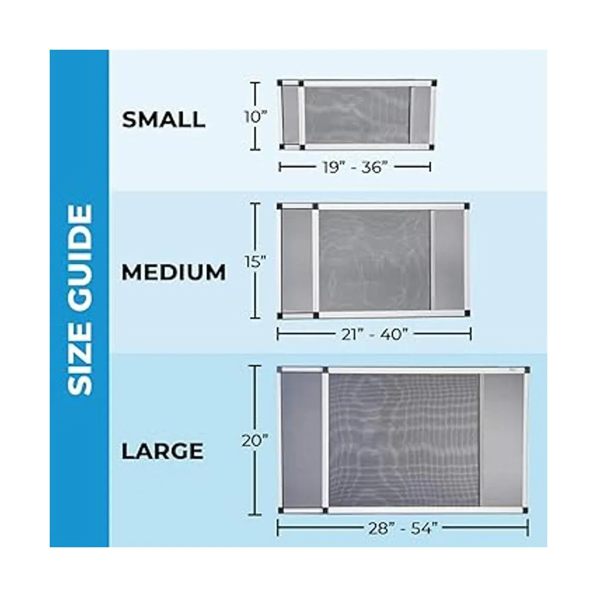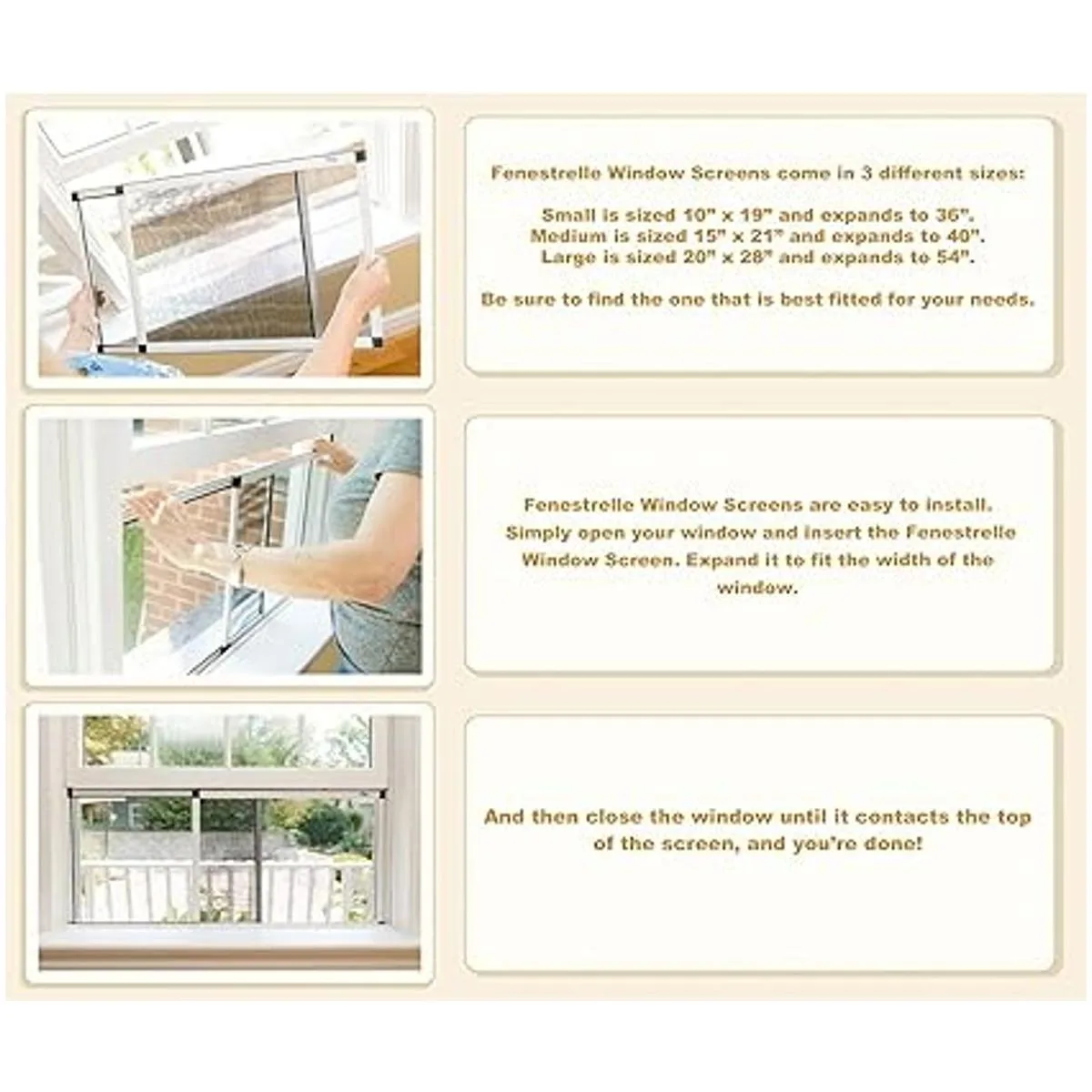 Varios tamaños Nuestras pantallas de ventana Fenestrelle vienen en varios tamaños diferentes para adaptarse a ventanas de todos los tamaños. Echa un vistazo a la tienda de la marca Fenestrelle para encontrar una talla perfecta para ti Nuestras pantallas de ventana medianas tienen dimensiones horizontales de 15 x 21 pulgadas y se expanden a 40 pulgadas de ancho. Como característica adicional, esta pantalla se puede convertir en orientación vertical. Las dimensiones verticales son de 21 x 15 pulgadas y se expanden a 28 pulgadas de ancho. Si deseas convertir tu pantalla, sigue las instrucciones de nuestro video.