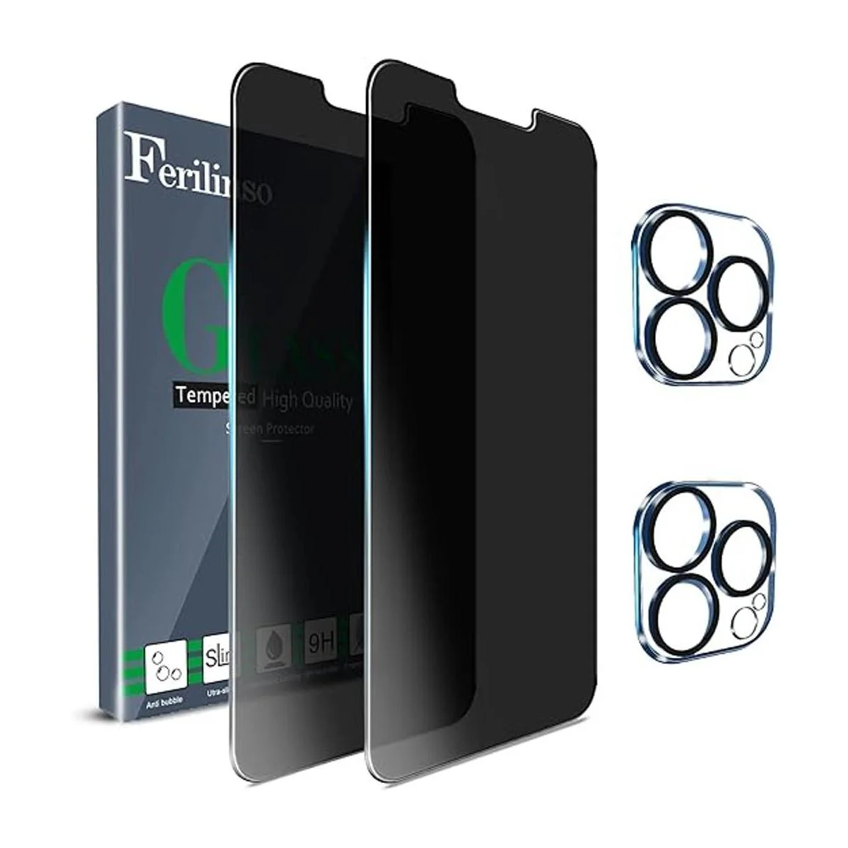 Ferilinso Diseñado para iPhone 13 Pro Protector de pantalla de privacidad, 2 unidades de vidrio templado antiespía 9H con 2 unidades de protector de lente de cámara, compatible con la funda, sin burbujas, 5G 6.1 pulgadas, fácil instalación