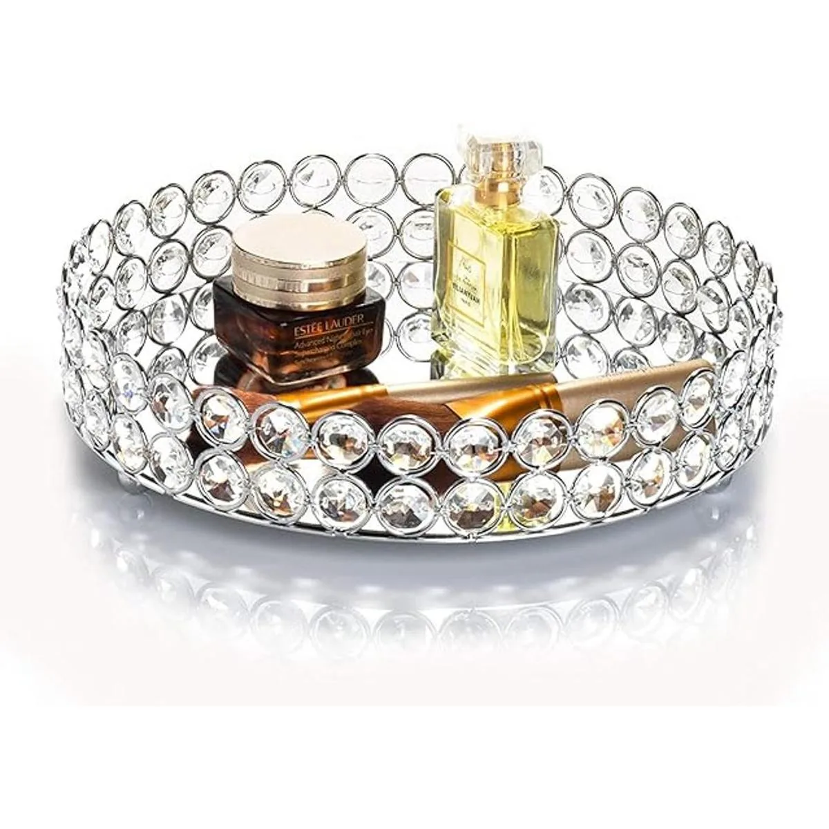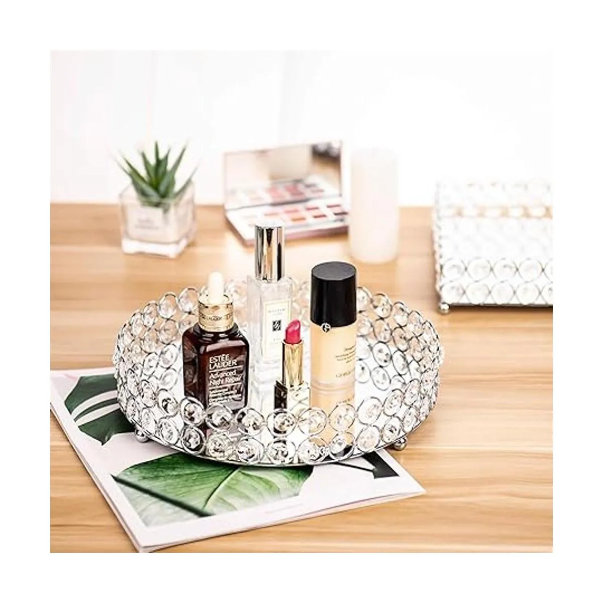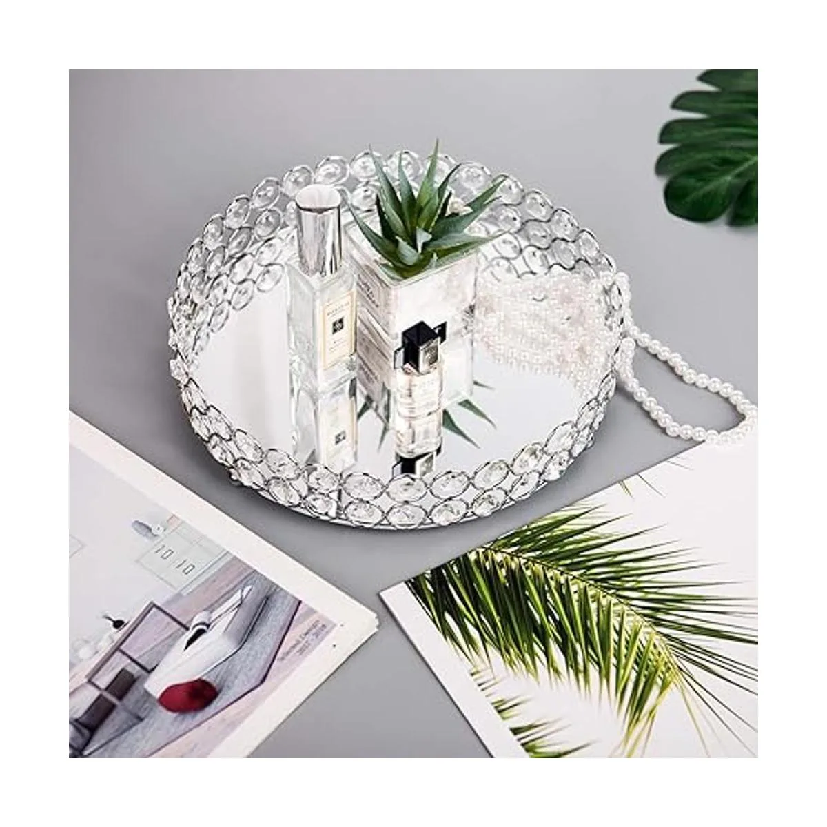 Feyarl Bandeja de maquillaje de cristal para cosméticos y joyas, bandeja organizadora de tocador, bandeja decorativa con espejo, bandeja decorativa para el hogar, tocador, perfume, bandeja para el cuidado de la piel, para regalo de Navidad redondo de 10 pulgadas plata