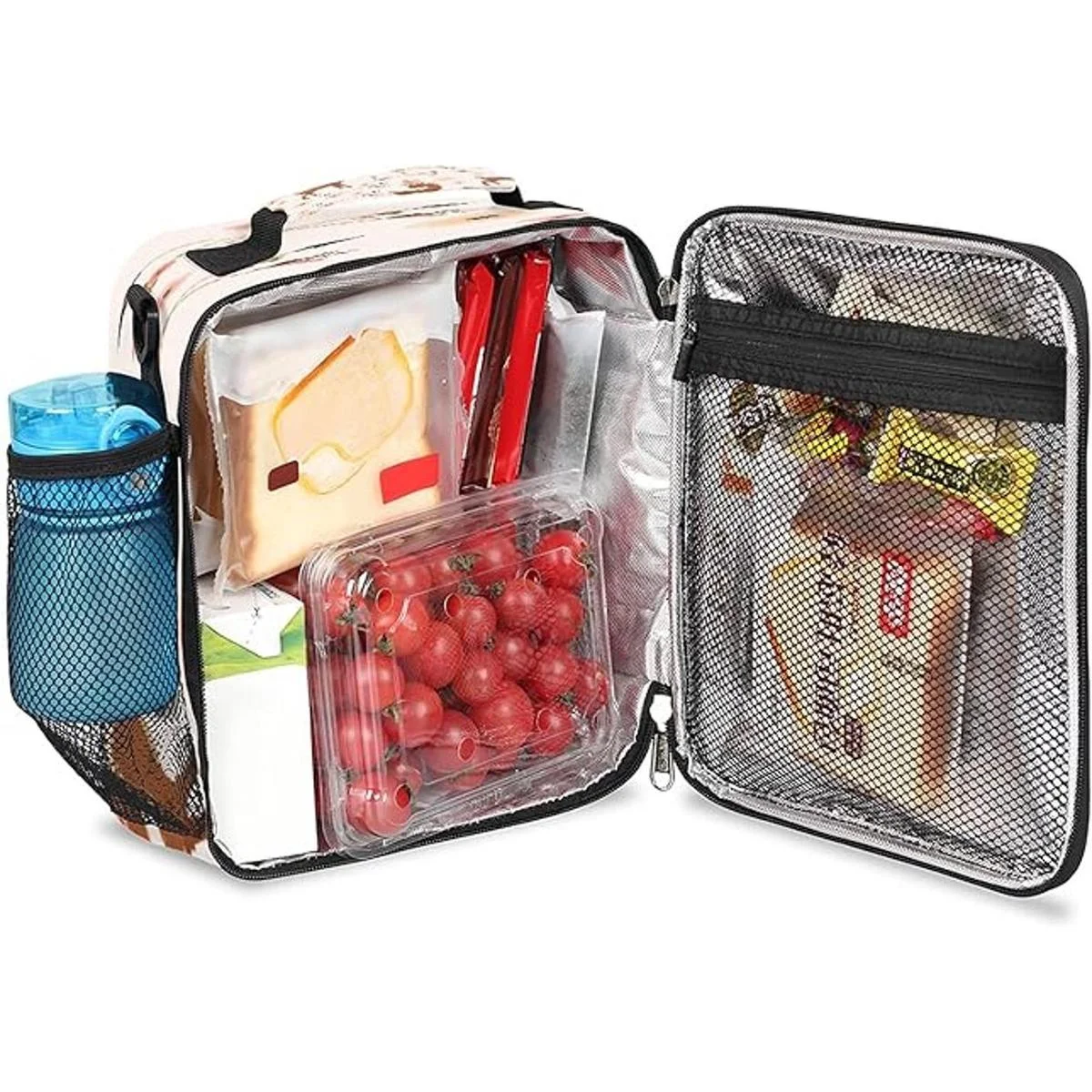 Gran capacidad y múltiples bolsillos: la lonchera rectangular es de 10.5 x 3.5 x 9.5 pulgadas. La bolsa de almuerzo incluye una bolsa principal para loncheras, bento, bebidas, frutas, etc. En el interior hay una bolsa de malla con cremallera para paquetes de hielo, aperitivos, pan y otros objetos pequeños, y una bolsa de malla lateral para colocar botellas de agua, paraguas y otros artículos.