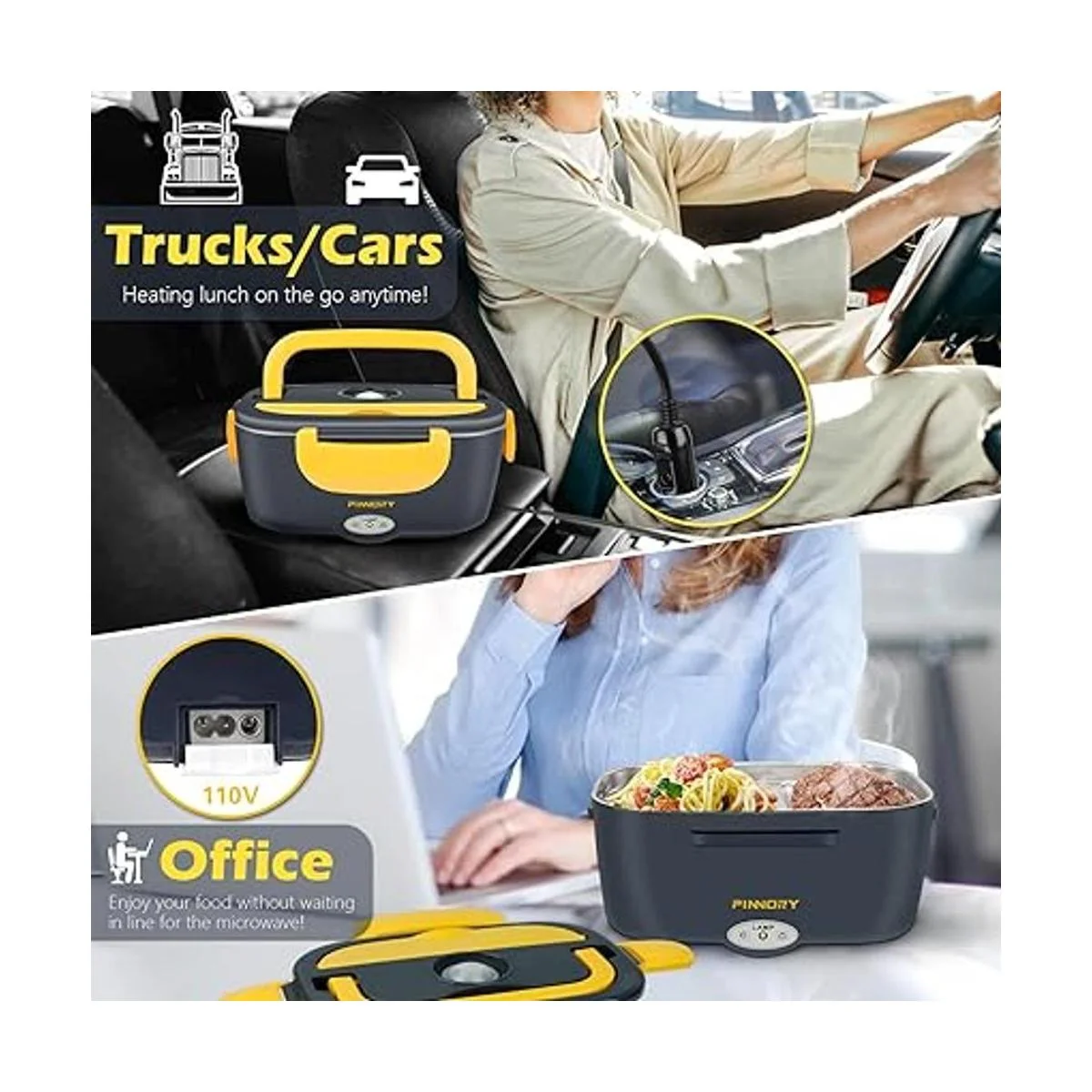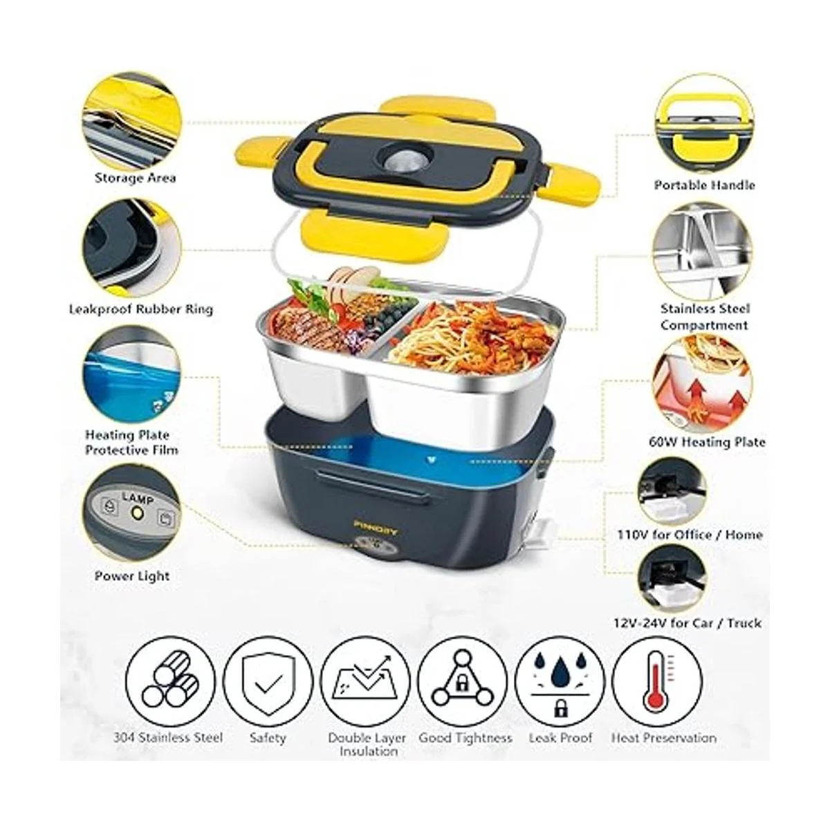 Diseño de lonchera 2 en 1: diseño 2 en 1 para recipiente extraíble de acero inoxidable 304, soporte de alta potencia de 60 W de 12 V/24 V para tus coches/camiones y 110 V para uso en el trabajo o en el hogar con calentamiento rápido. Diseño de dos compartimentos para separar tus alimentos favoritos, como guisos, espaguetis, lasaña, albóndigas, macarrones y queso. Adecuado para aquellos que quieren llevar el almuerzo solos, como trabajadores de la construcción, camioneros, conductores, empleados de oficina de empresa, etc.
