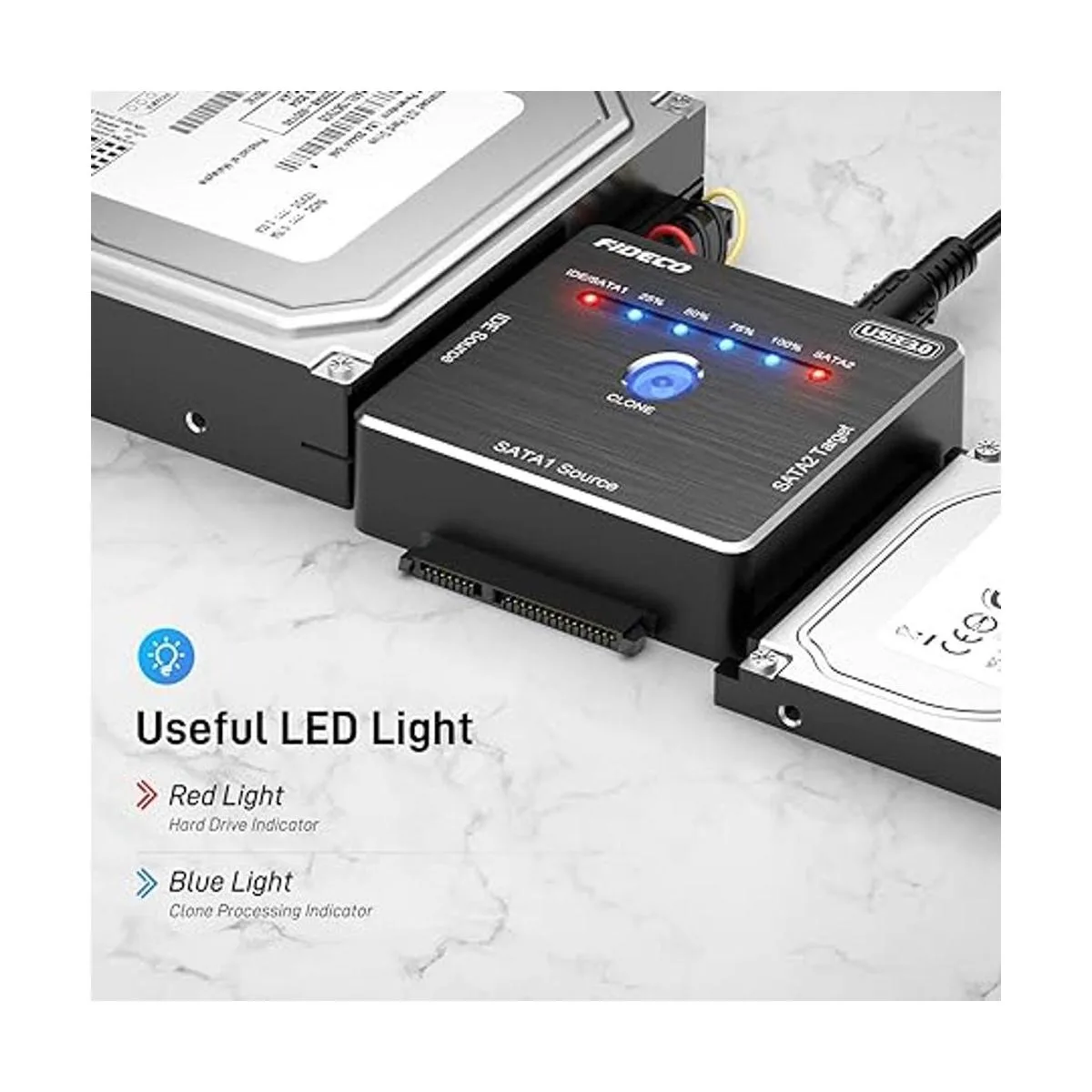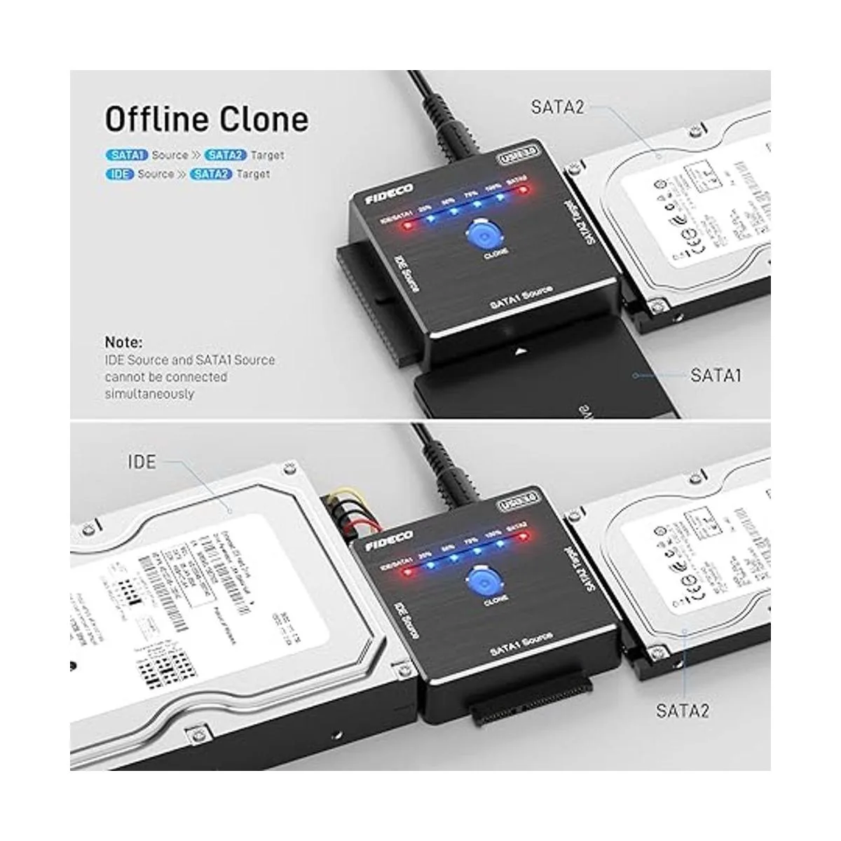 Clonación sin conexión El convertidor de disco duro FIDECO puede soportar clon sin conexión. No se necesita computadora Simplemente pulsa el botón CLONE durante 3 segundos hasta que la primera luz azul 25 parpadee. Puedes operar clon sin conexión solo en 2 combinaciones: Fuente IDE Objetivo SATA2; Fuente SATA1 Objetivo SATA2. Requisito de capacidad: SATA2 Target IDE/SATA1 Source.