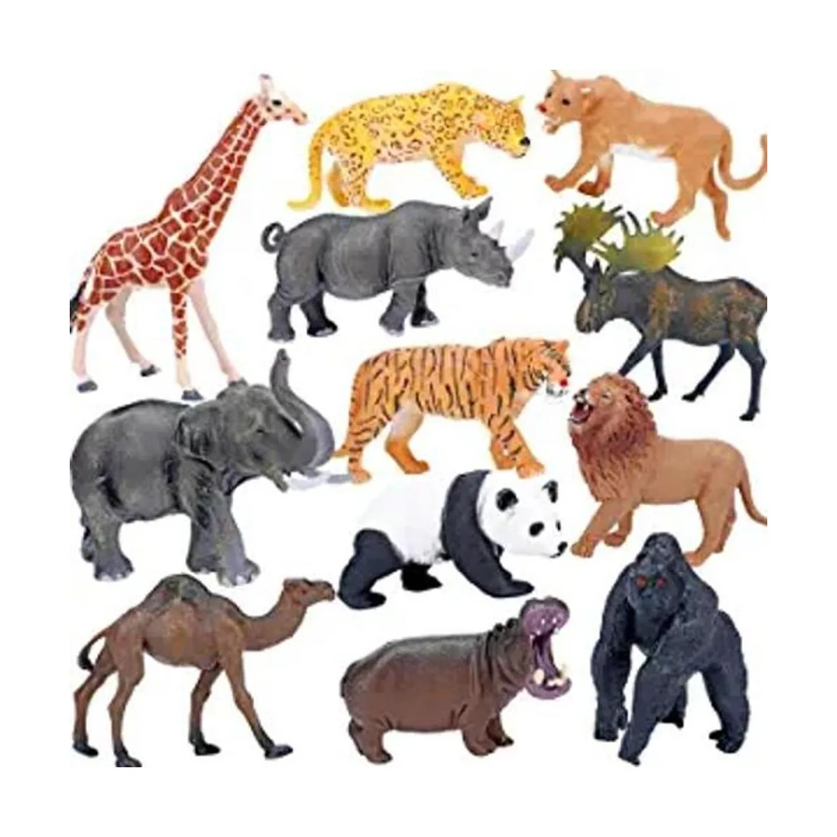 Animales SAFARIS: 12 animales únicos de la selva de plástico no repetidos con colores vibrantes, miden aproximadamente 5 a 6.3 pulgadas de longitud. Incluye tigre, león, león, gorila, elefante, panda, jirafa, guepardo, rinoceronte, camello, alce, hipopótamo.
