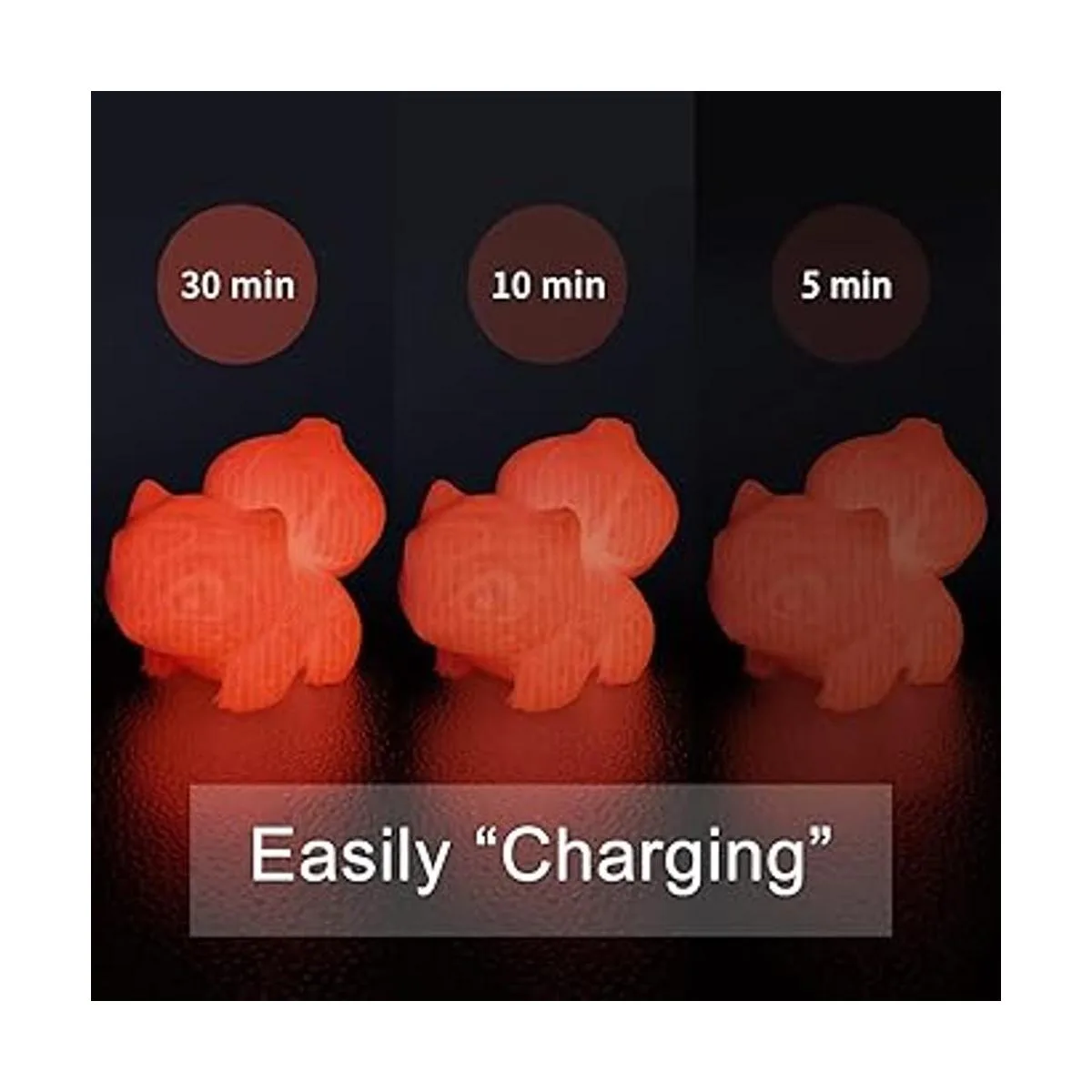 Seguro de usar y hecho de materiales naturales, fiable y duradero. Certificado CE, RoHS por autoridad. La sustancia fosforescente en el filamento PLA absorbe la energía de la luz y emite luz en la oscuridad. Para obtener mejores resultados, recomendamos que el modelo esté expuesto a la luz solar o UV durante 15 minutos.