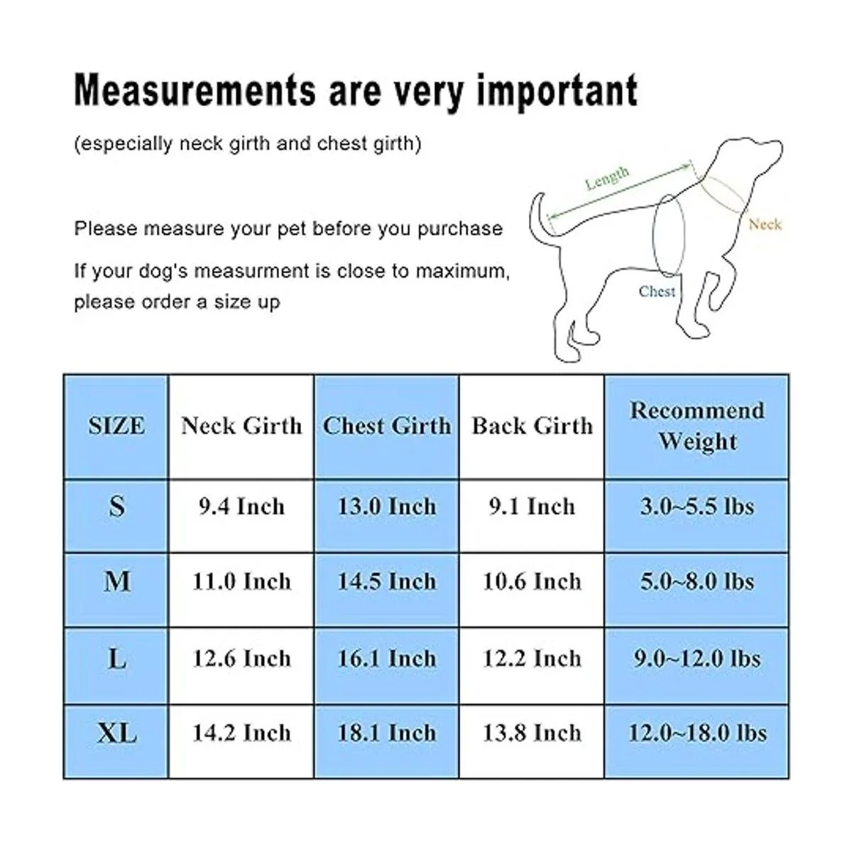 Talla L: contorno del pecho: 16.1, longitud de espalda: 12.2, circunferencia del cuello: 12.6; recomendado para 9.012.0 libras. El tamaño es pequeño, las medidas son muy importantes, mide a tu perro alrededor de la parte más ancha del pecho y del cuello inferior, luego consulta la tabla de tallas. No selecciones el tamaño según el nombre de la raza/talla u otras marcas.