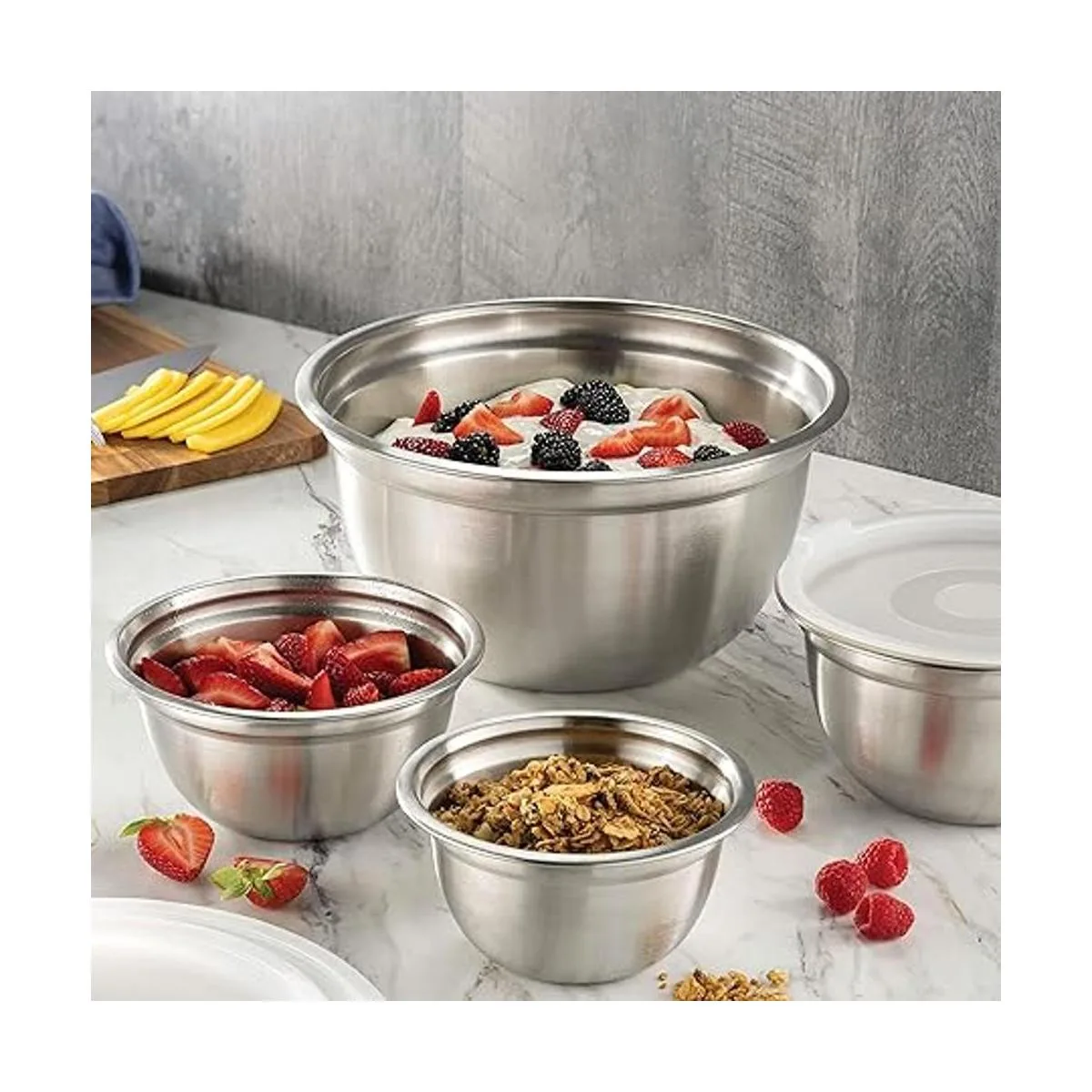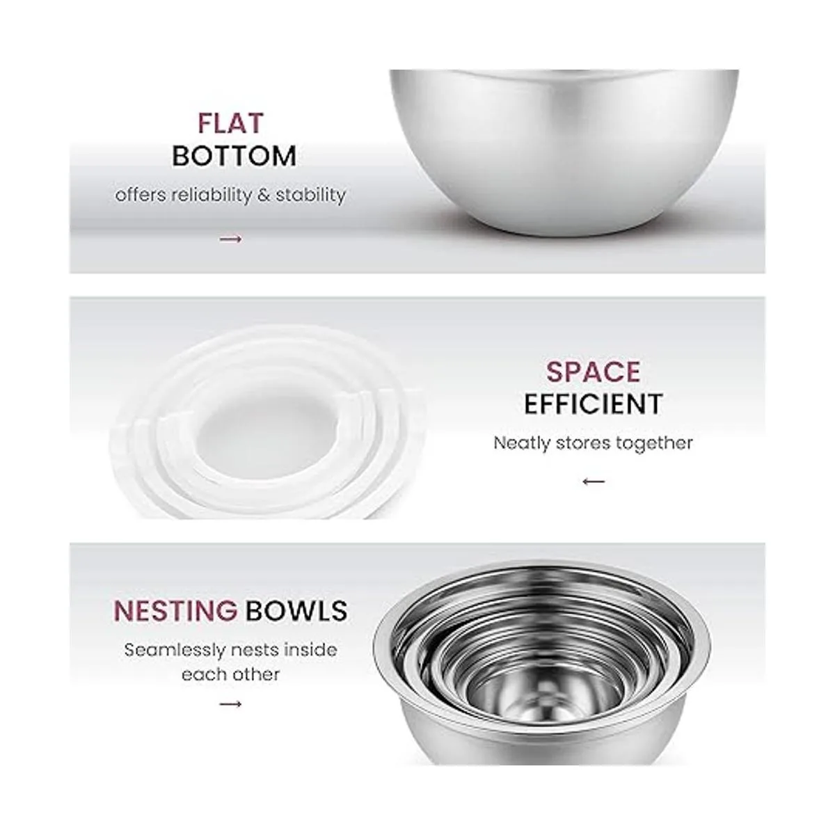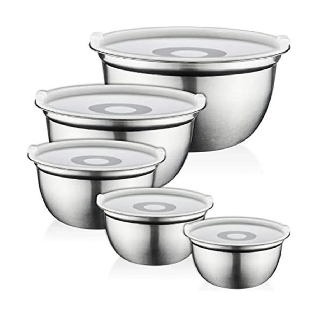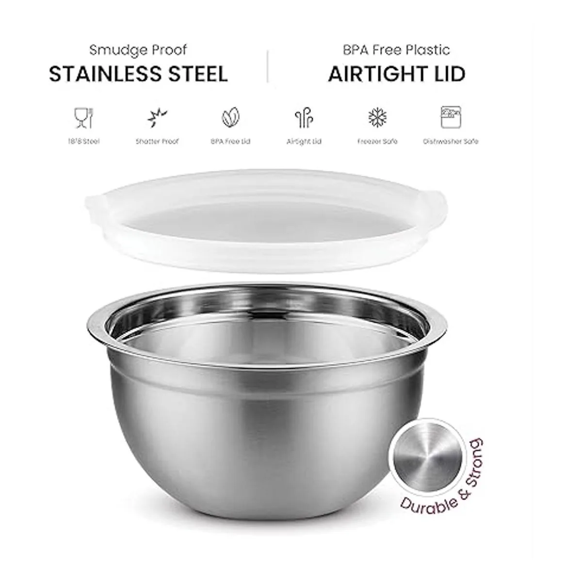 Tapas herméticas: este juego de cuencos de acero inoxidable viene con tapas herméticas sin BPA que proporcionan un agarre fácil y antideslizante en cada recipiente. Perfecto para verter masa, amasar masa, lanzar ensaladas, batir huevos y mucho más.