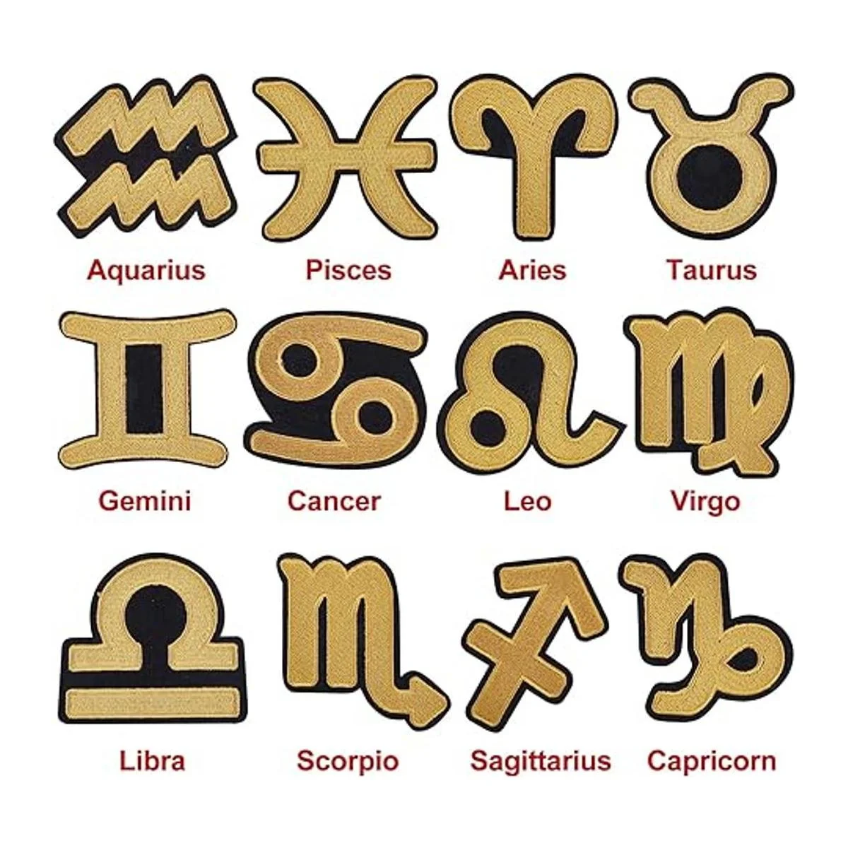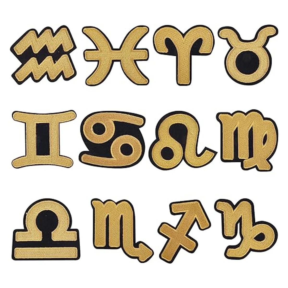Fingerinspire 12 símbolos de constelación oro zodíaco bordado para planchar y coser apliques 12 piezascaja signo zodiacal bordado de computadora