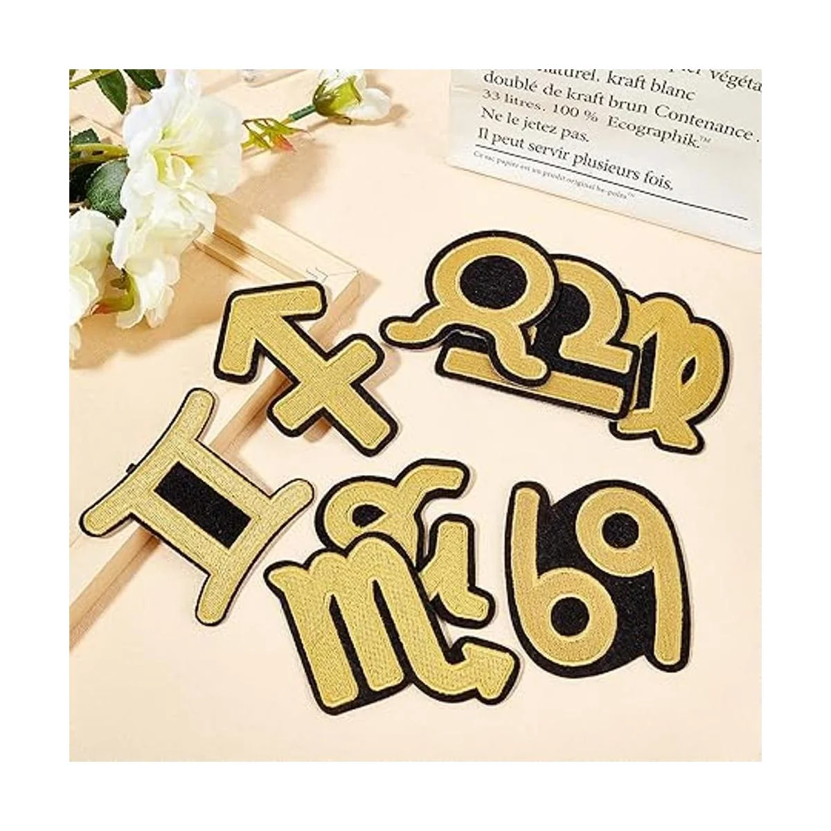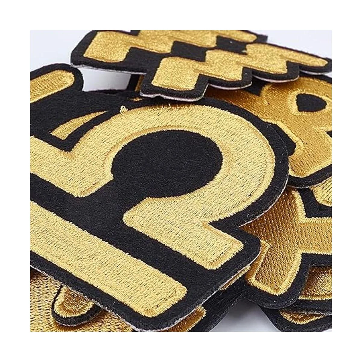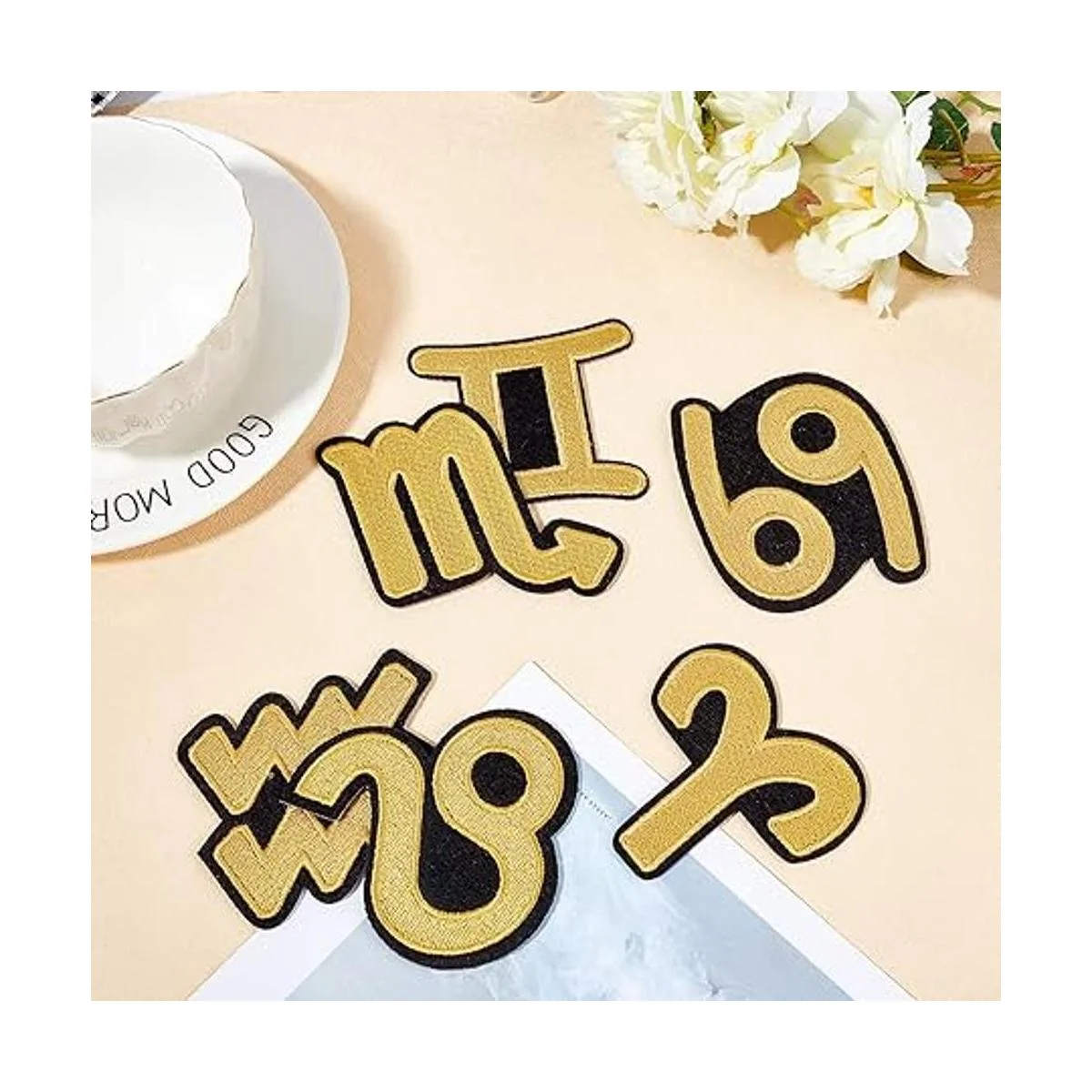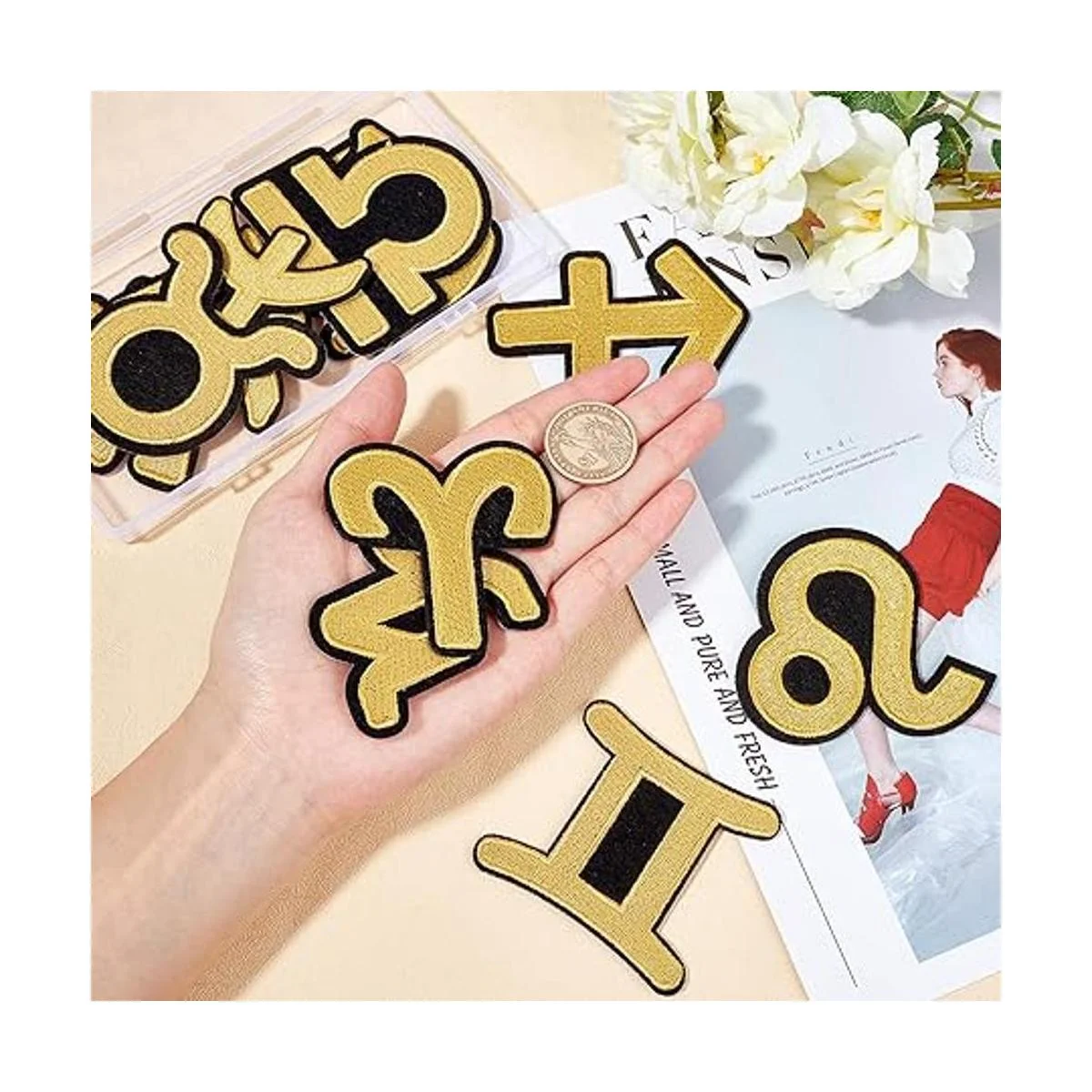Contenido del paquete: 12 unidades por caja de símbolos de constelación dorados, bordado del zodiaco.