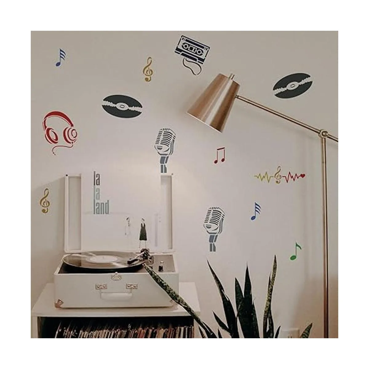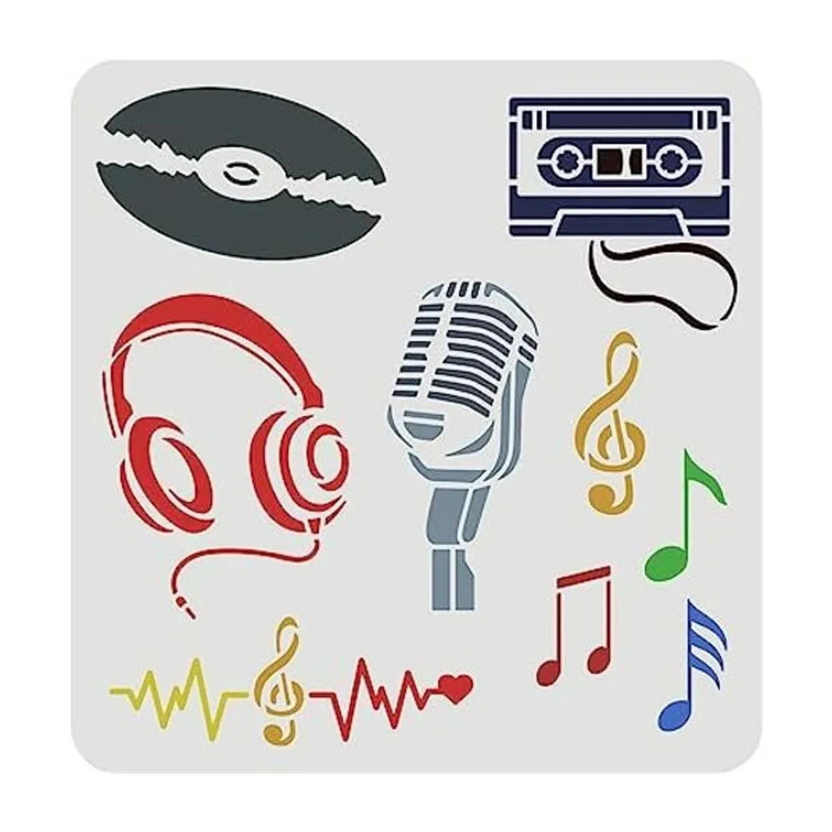 Plantilla temática musical: plantilla de plástico con notas, micrófono, cinta, CD y patrones de auriculares impresos en el medio, patrones ricos y hermosos. Tamaño aproximado: 11.8 x 11.8 in.