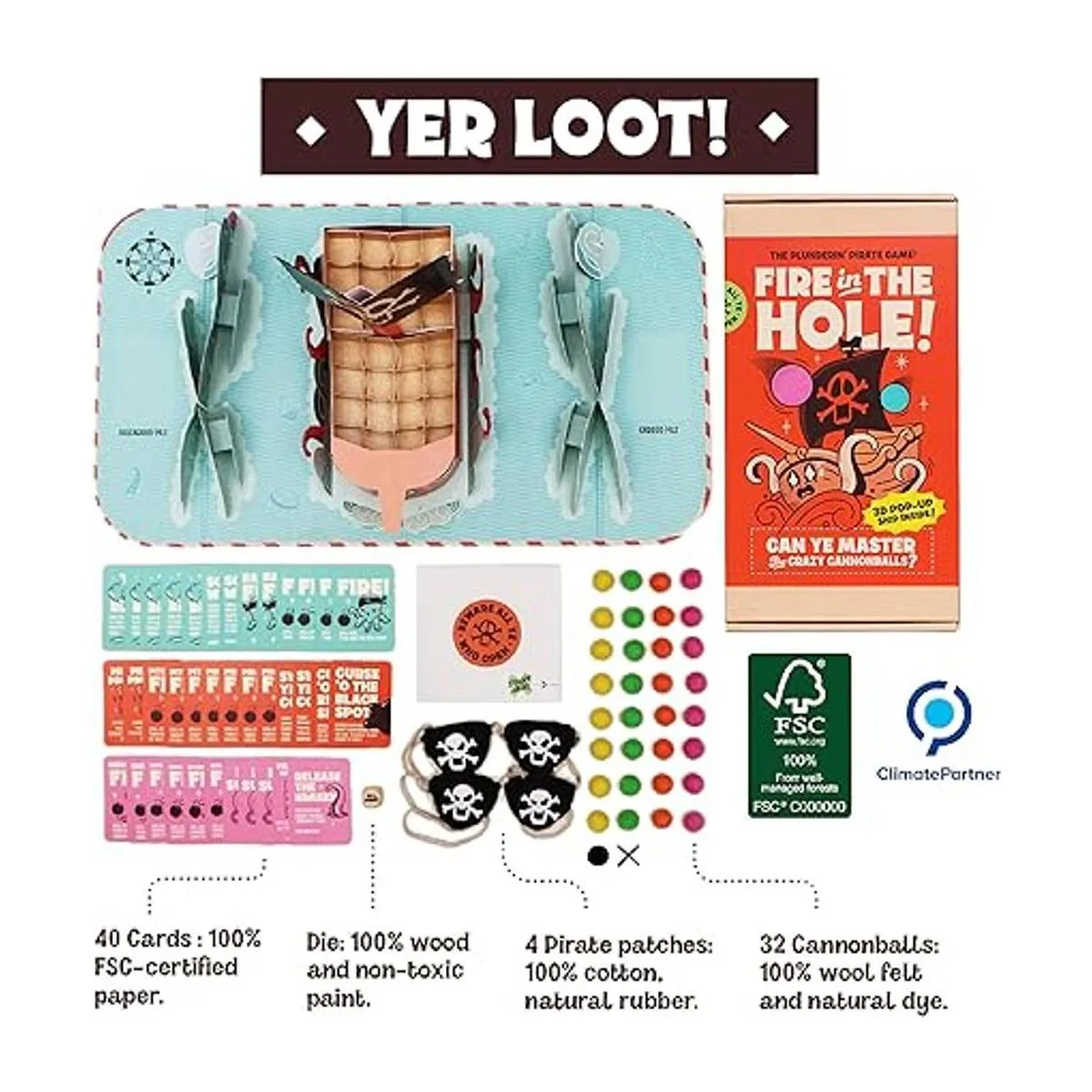 Salva los siete mares El fuego en el agujero es 100 libre de plástico y neutro en carbono. Hecho de cartón y papel resistentes certificados FSC, bolas de cañón de fieltro de lana, 100 algodón orgánico y látex de goma natural, Fire In The Hole es uno de los juegos más sostenibles del mercado.