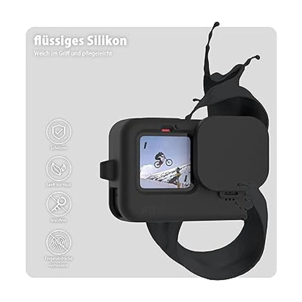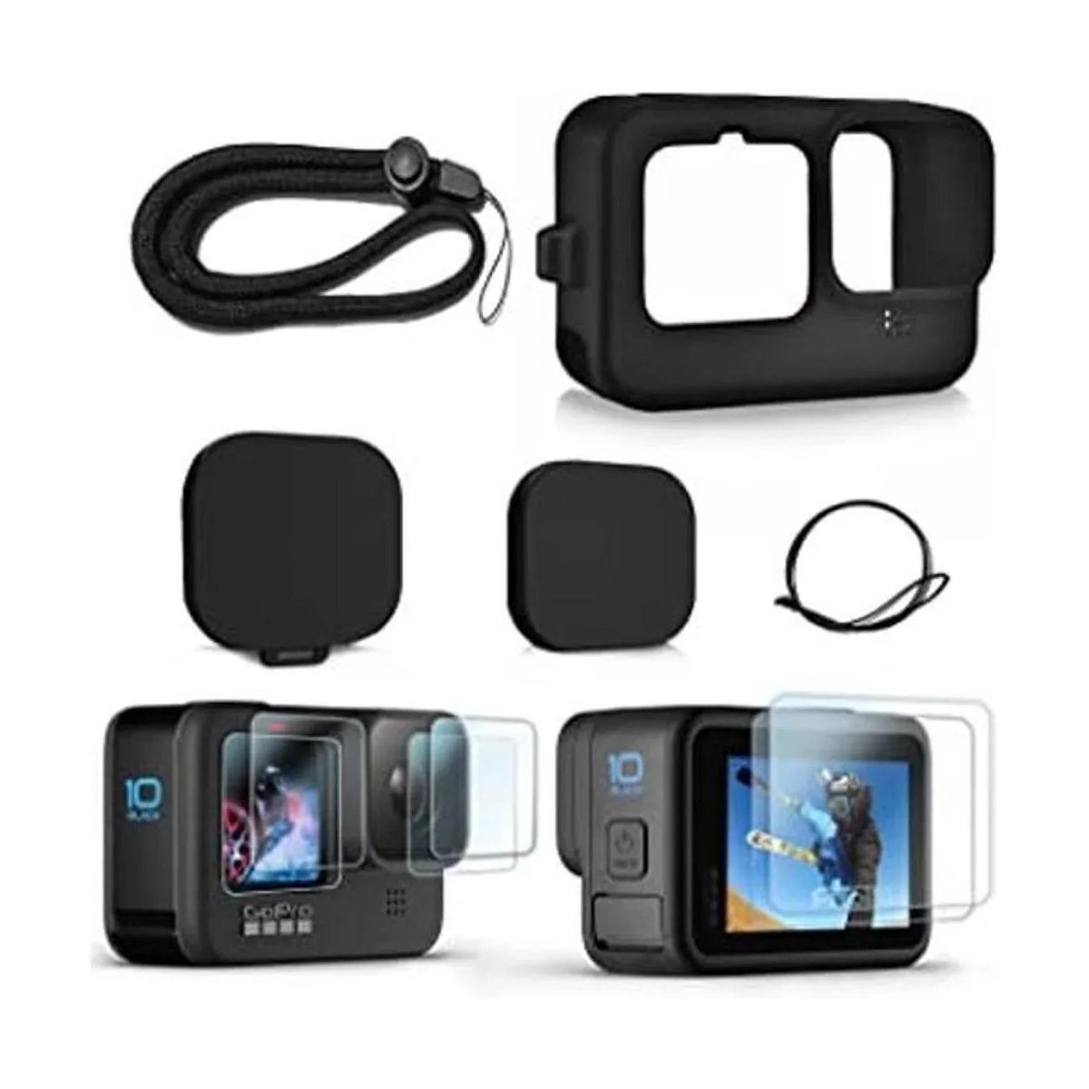 FitStill Funda de goma de silicona paquete de 2 6 unidades protectores de vidrio templado compatibles con Go Pro Hero11 Hero10 Hero9 negro, carcasa de jaula de manga suave con tapa de lente, kit de accesorios de cordón