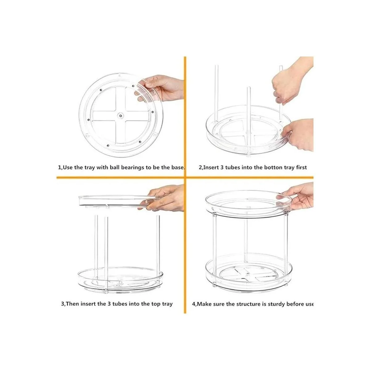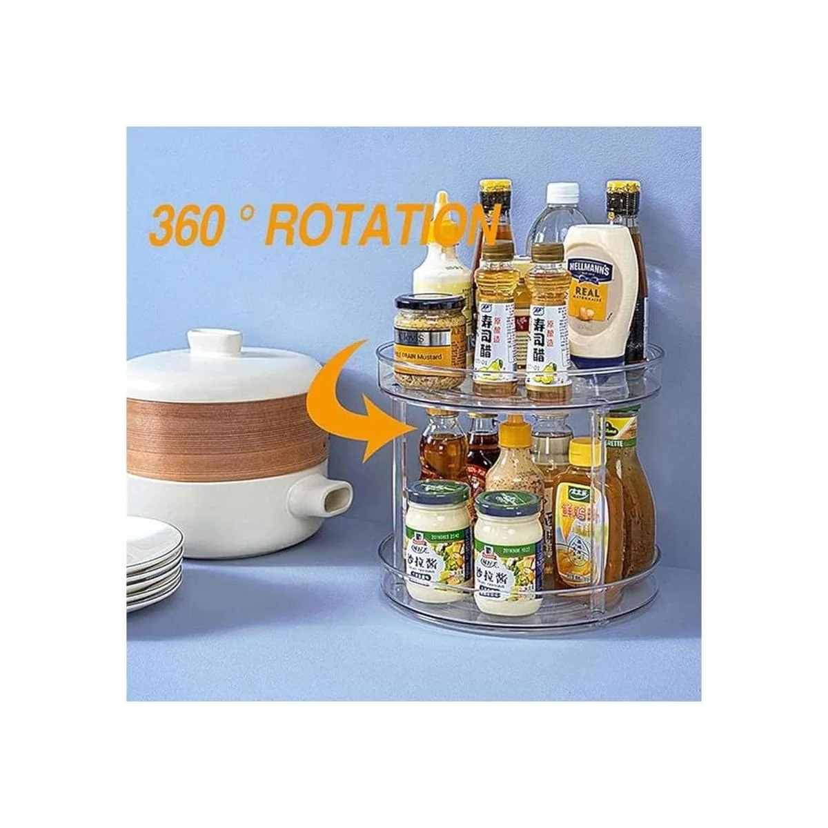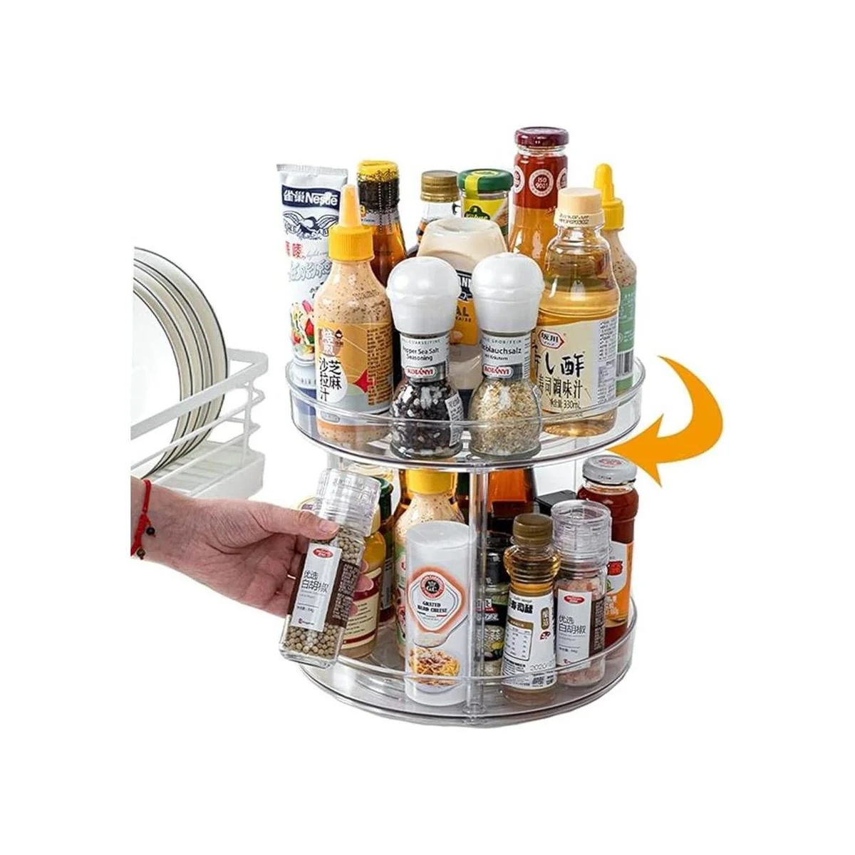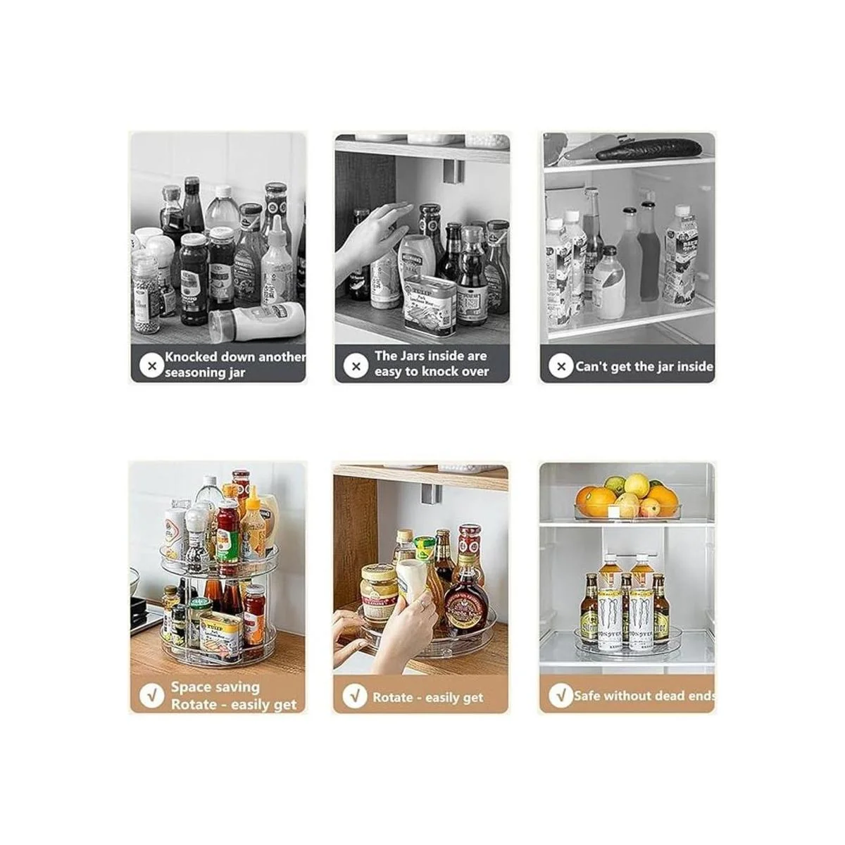 Diseño abierto con bordes elevados: los bordes elevados de nuestro plato giratorio Lazy Susan de dos niveles evitarán que los artículos se caigan mientras giras el organizador. Diseño abierto y paredes de plástico transparente que te permiten ver fácilmente el contenido.