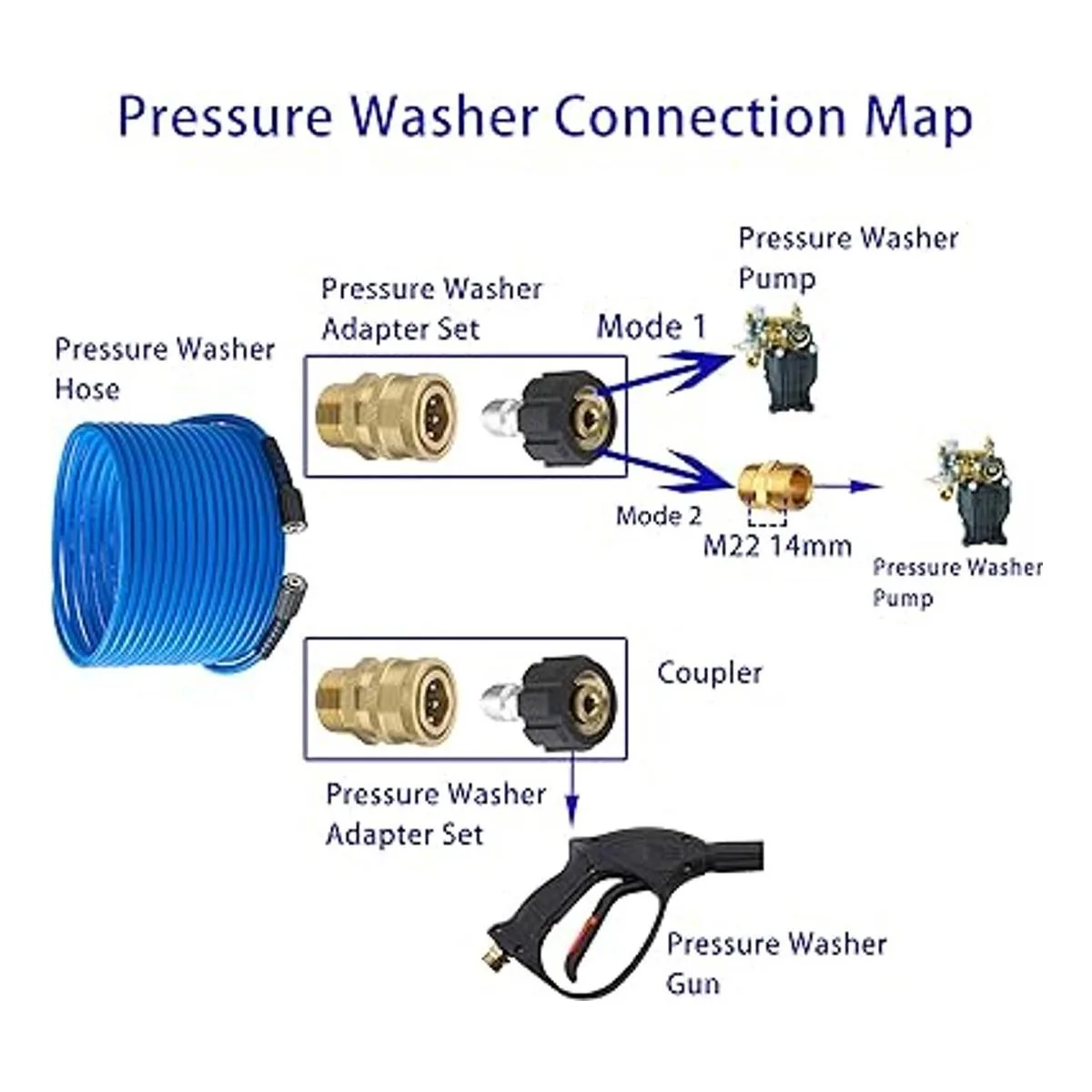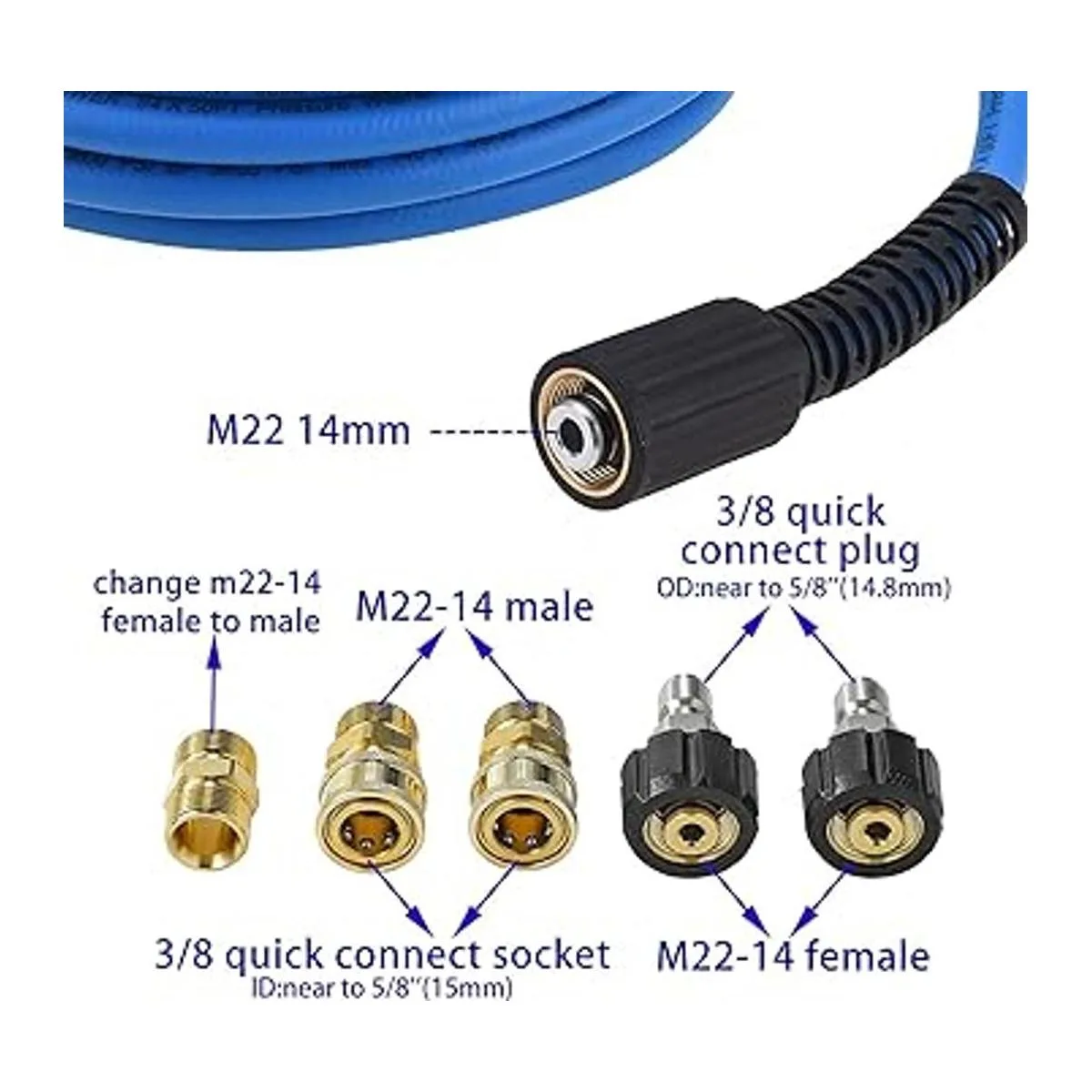El paquete incluye: una manguera de lavado de alta presión compatible con M22 de 50 pies, un acoplador macho M220.551 in y dos juegos de adaptadores hembra M220.551 in enchufe de 3/8 pulgadas, desconexión rápida de 3/8 pulgadas macho M220.551 in