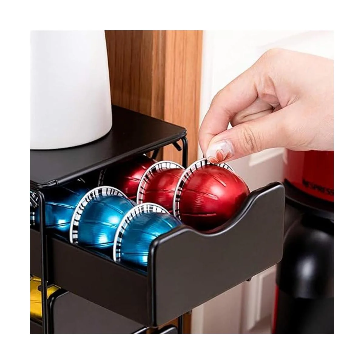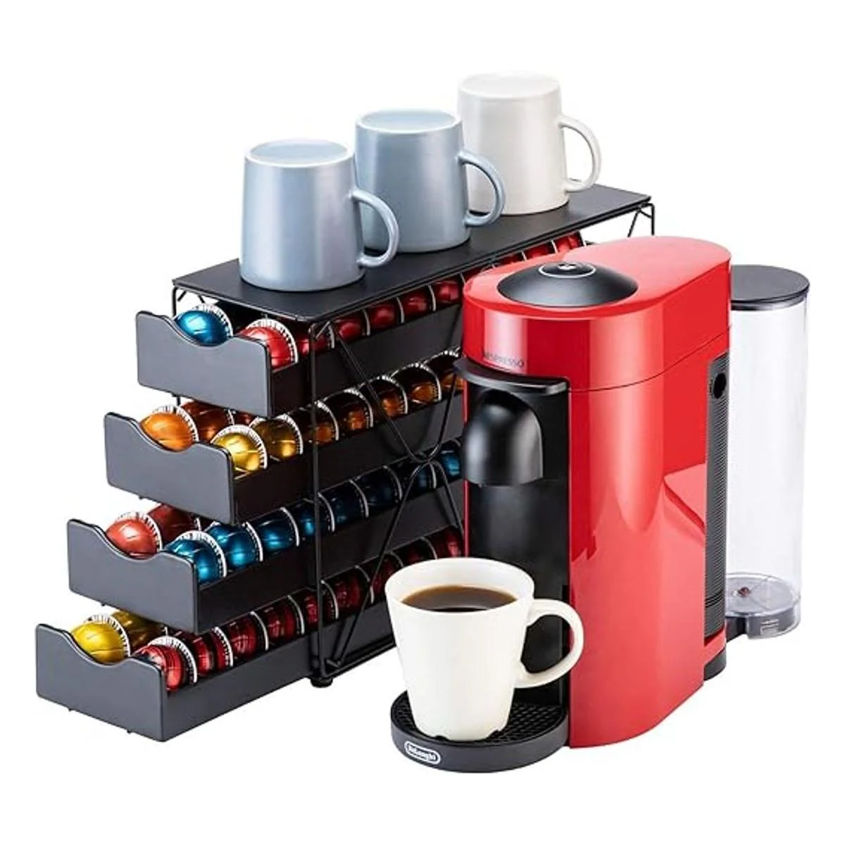 Nuevo diseño 2021: el diseño moderno de soporte multicapa mantiene tus cápsulas ordenadas y limpias y tu mostrador. Encuentra tu sabor favorito de café rápida y fácilmente con el sistema de niveles. Puedes colocar tazas y accesorios en la parte superior de los cajones para tener todo en un solo lugar que puedas necesitar.