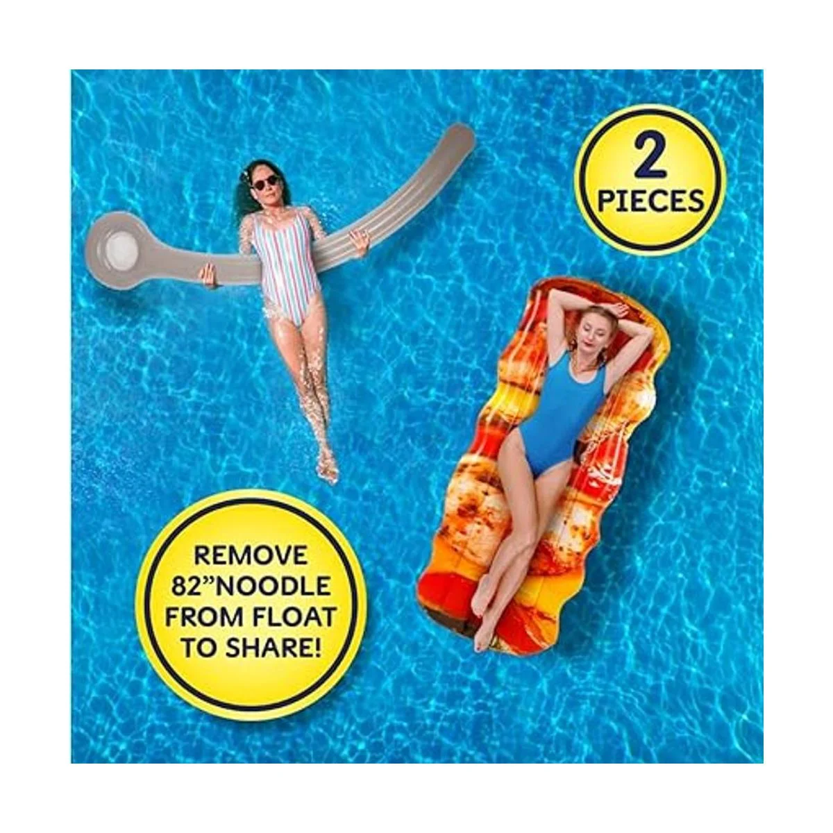 Tira del pincho central para un fideo inflable separado de 82 pulgadas de alto. Los fideos se deslizan dentro y fuera de la cámara central del flotador. Por qué tomar uno, cuando puedes tomar 2