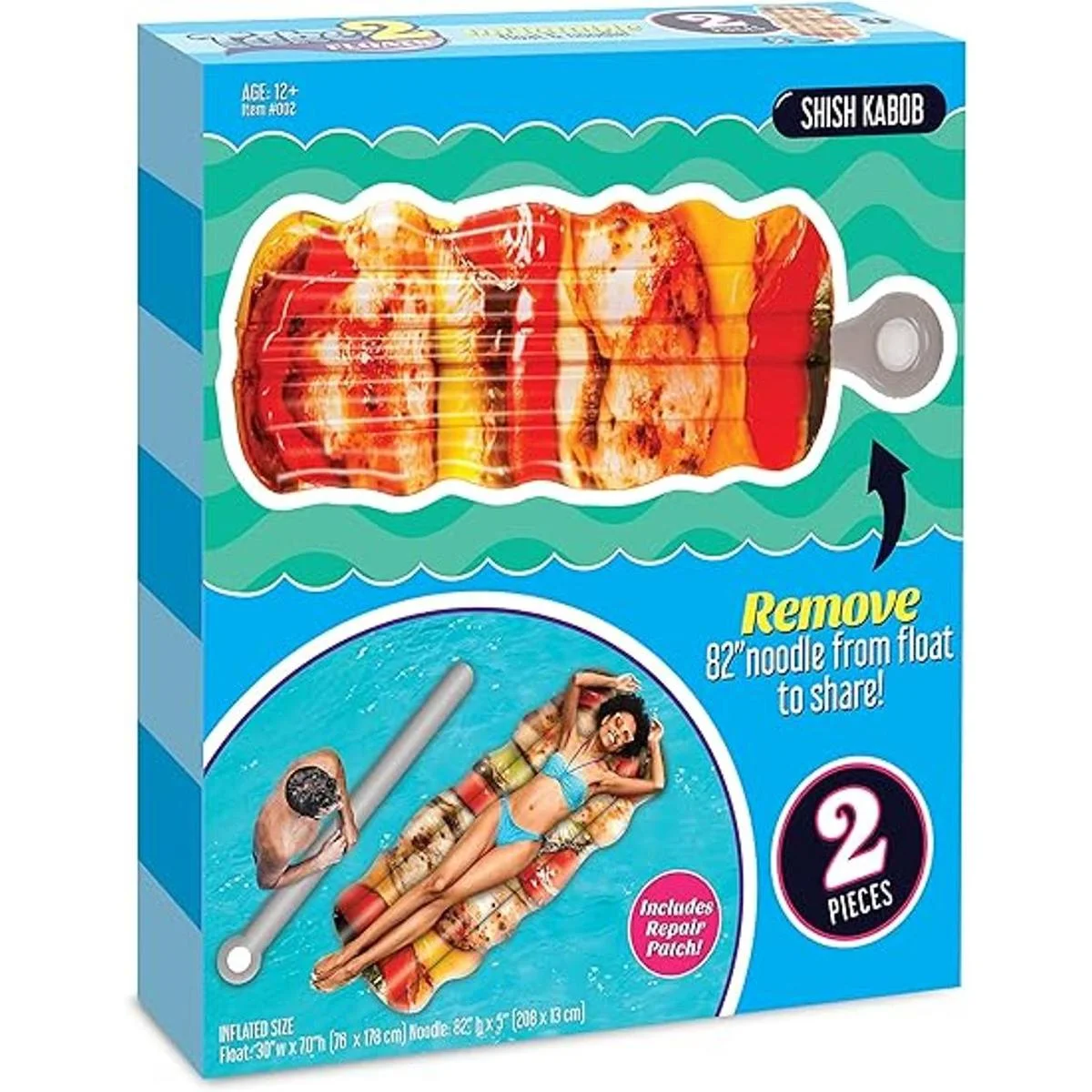 Tamaño del producto: flotador inflable grande: 30 pulgadas de ancho x 70 pulgadas de alto. fideos inflables: 82 pulgadas de alto x 5 pulgadas de profundidad. La edad mínima recomendada es de 15 años.