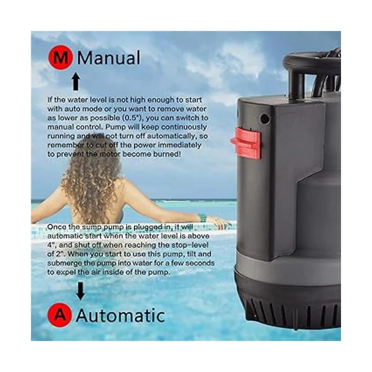 Modo automático: una vez que la bomba de sumidero esté conectada, se iniciará automáticamente cuando el nivel de agua sea superior a 4 pulgadas y se apagará cuando alcance el nivel de parada de 2 pulgadas. Cuando empieces a utilizar esta bomba, inclina y sumerge la bomba en agua durante unos segundos para expulsar el aire dentro de la bomba.