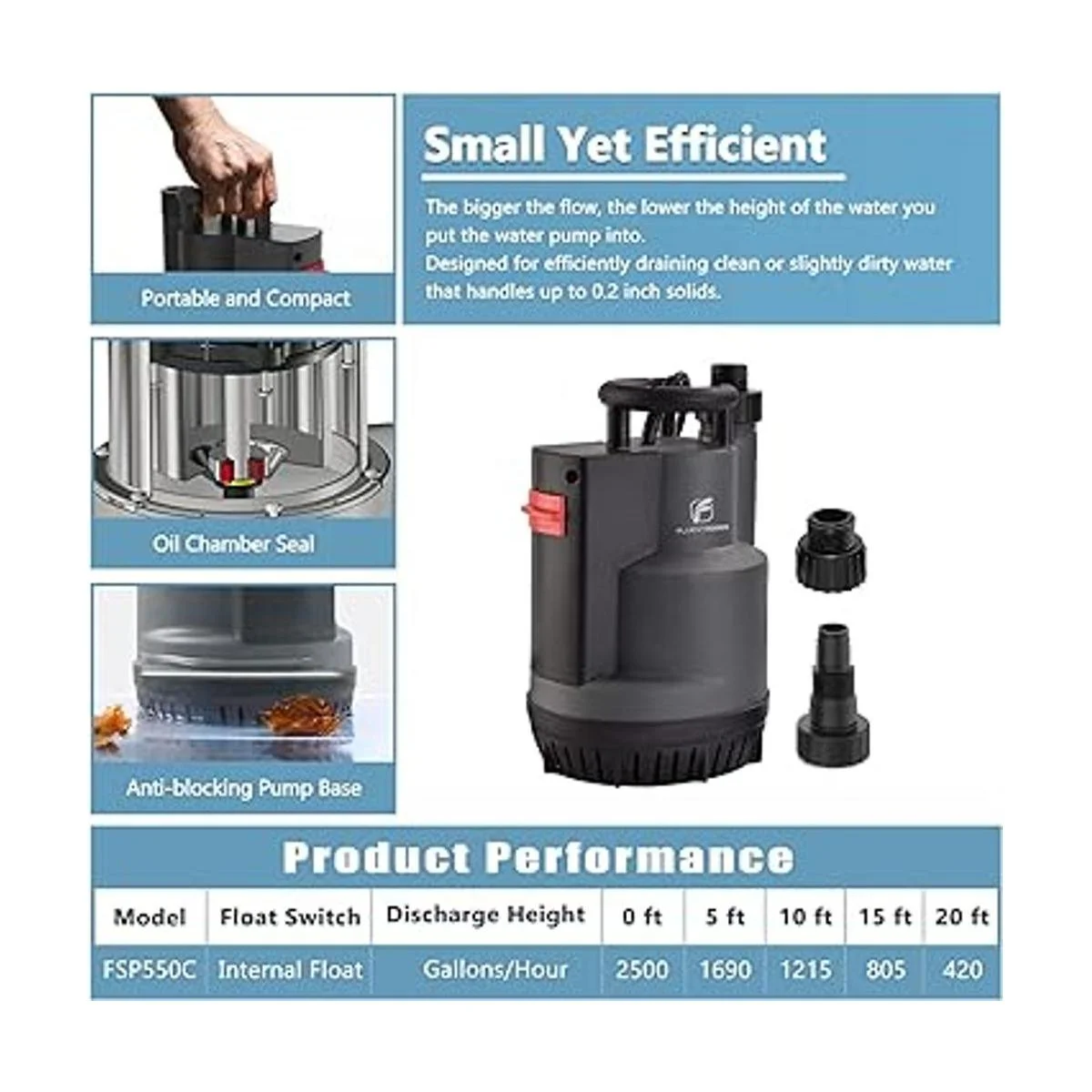 FLUENTPOWER Bomba de sumidero de 12 HP 2500 GPH, operación manual automática o continua por interruptor de flotador integrado, drenaje de agua limpia para sótano, inundación, sótano, piscina, estanque, jardín, bañera de hidromasaje