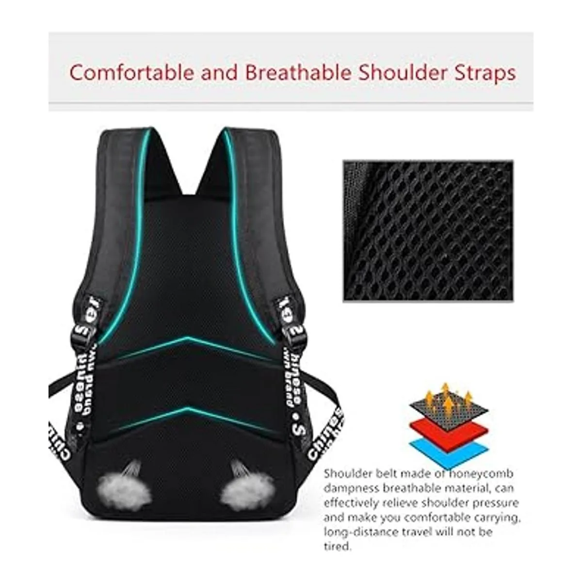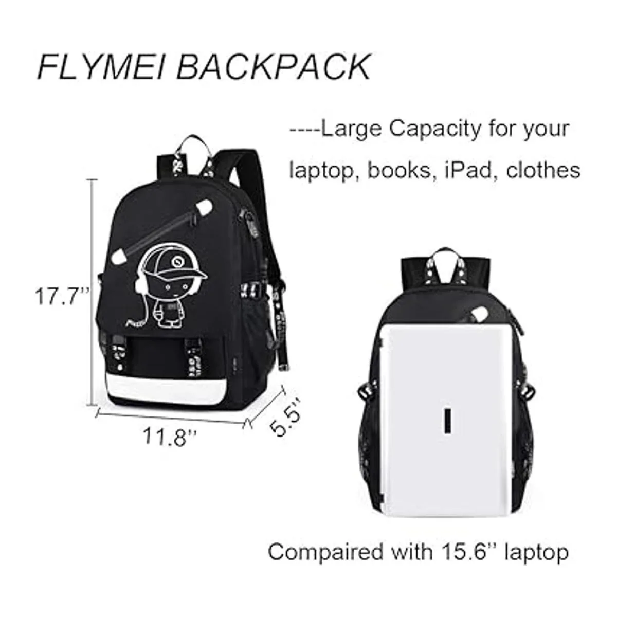 FLYMEI Mochila luminosa de anime para niños, mochila para laptop de 15.6 pulgadas con puerto de carga USB, bolsa de libros para la escuela con bloqueo antirrobo, mochila negra para adolescentes para niños, Negro, 17.7 X 11.8 X 5.5