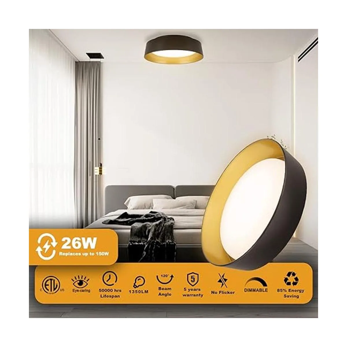 Flynix Lámpara de techo LED de 12.5 pulgadas, 26 W, superbrillante, 1350 lúmenes, 3 colores 3000 K4000 K5000 K, negro mate con interior dorado, lámpara de techo regulable para dormitorio, pasillo, baño, exterior