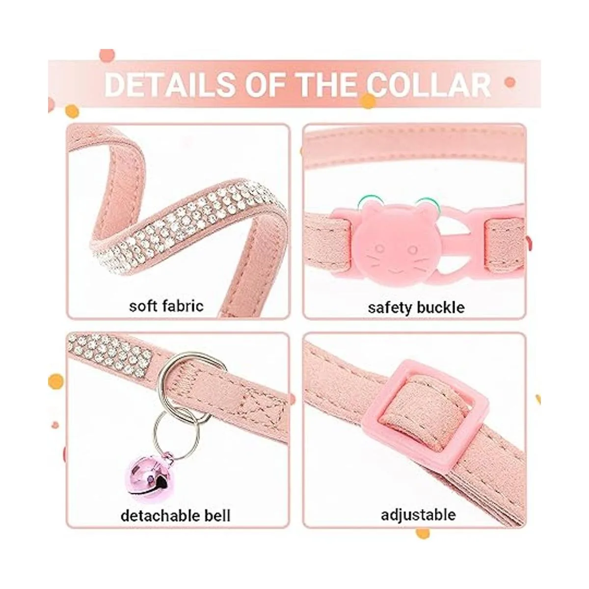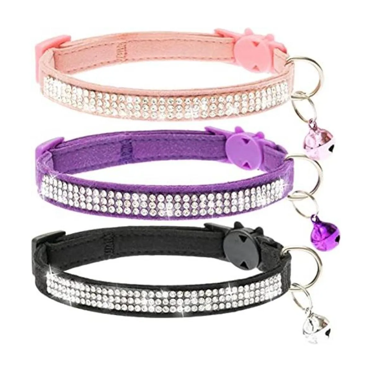 FLYSTAR Collar de gato con campana, bonito collar de gato para niños y niñas, gatos, con diamantes de imitación, ajustables, de terciopelo suave, para mascotas, para gatos SML, cachorros rosa, morado, negro