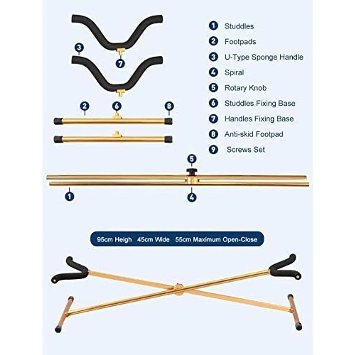 Material: aluminio de alta resistencia; esponja de baja densidad; plásticos de ingeniería antideslizantes