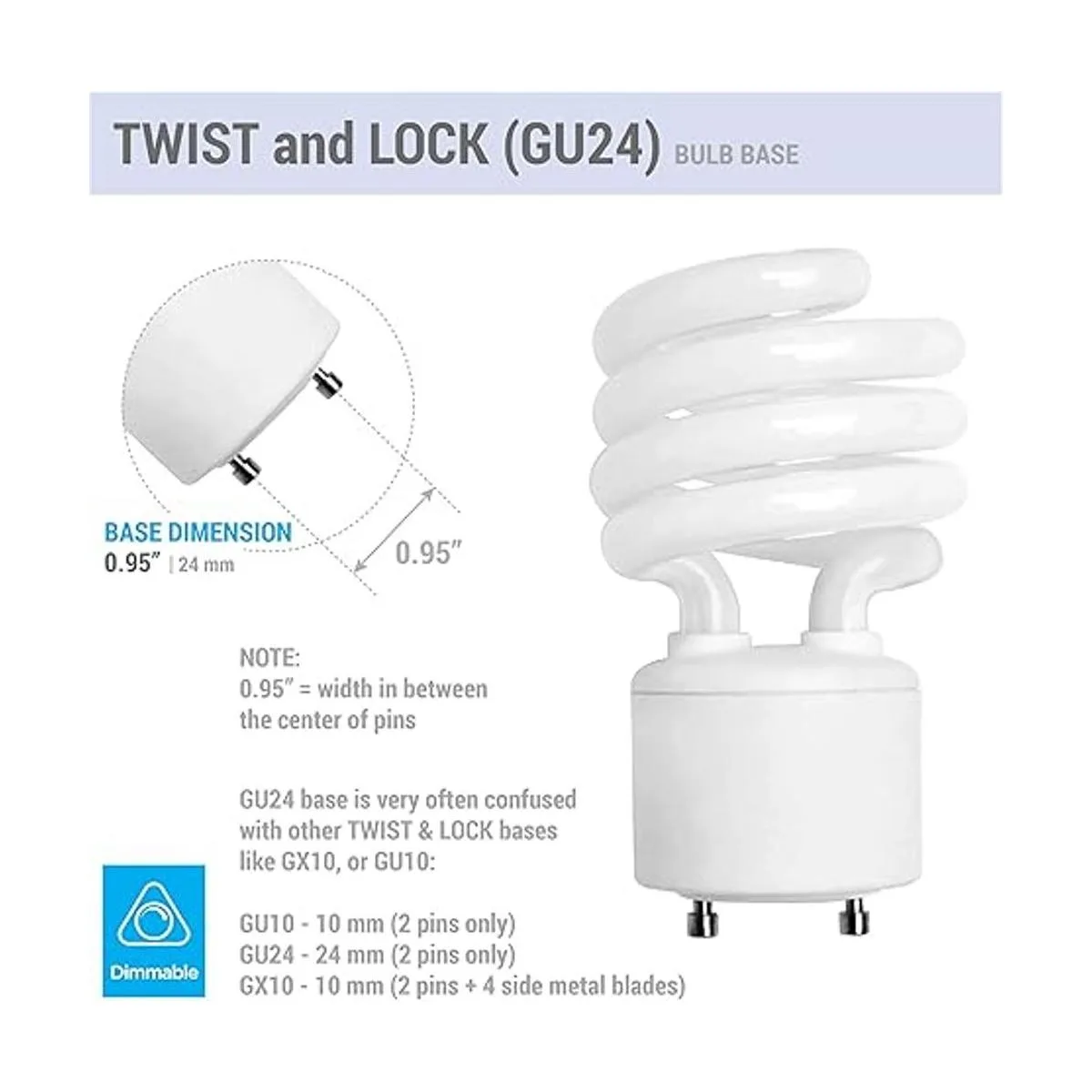 EASY INSTALLATION: These household CFL GU24 Spiral Light bulbs is a compact fluorescent / CFL spiral bulb that uses a GU24 Twist and Lock base. It perfectly into your existing GU24 socket so there is no need to change anything in your fixture. The GU24 base installs very easily and hassle free. Simply push it in and twist it.