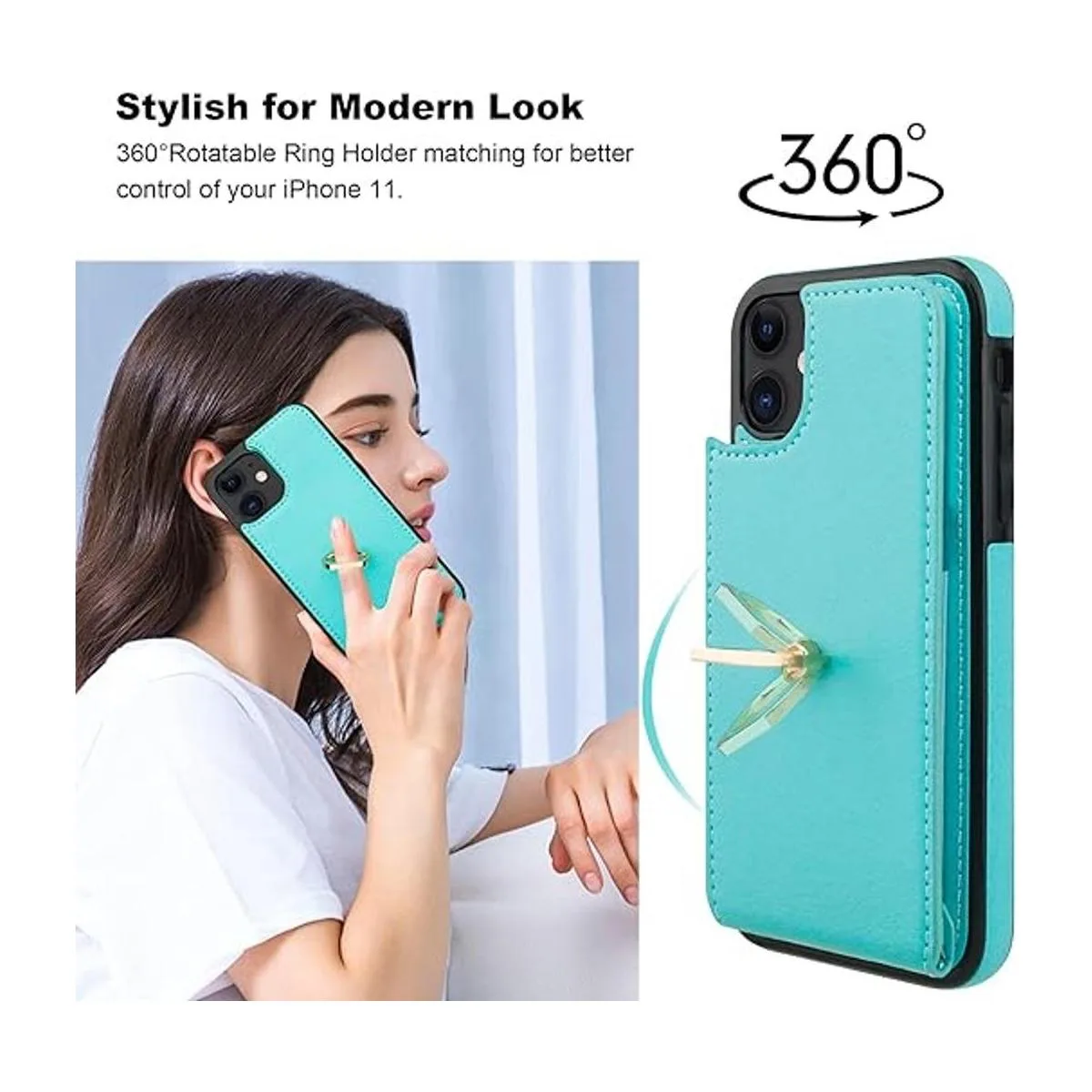 Folosu Funda compatible con iPhone 11 con soporte para tarjetas, soporte de anillo de dedo de rotación de 360, soporte protector de bloqueo RFID, piel sintética, doble botón, cubierta a prueba de golpes, 6.1 pulgadas, verde