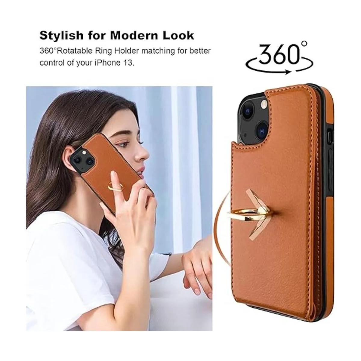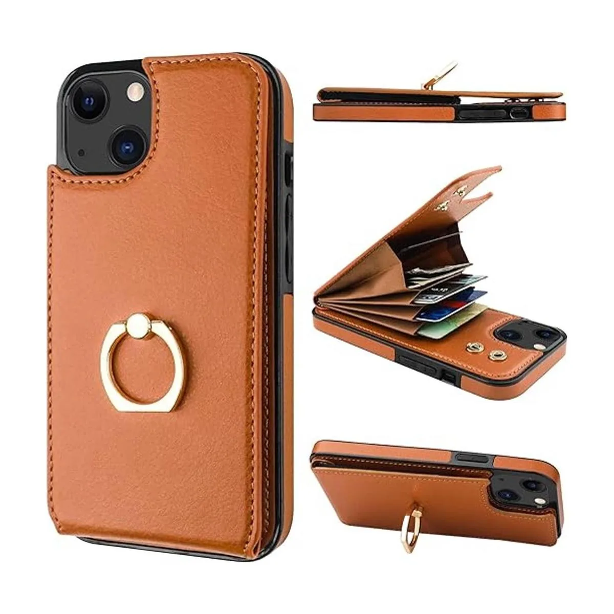 Folosu Funda compatible con iPhone 13 con soporte para tarjetas, soporte de anillo de dedo de rotación de 360, soporte protector de bloqueo RFID, piel sintética, doble botón, cubierta a prueba de golpes, 6.1 pulgadas, marrón