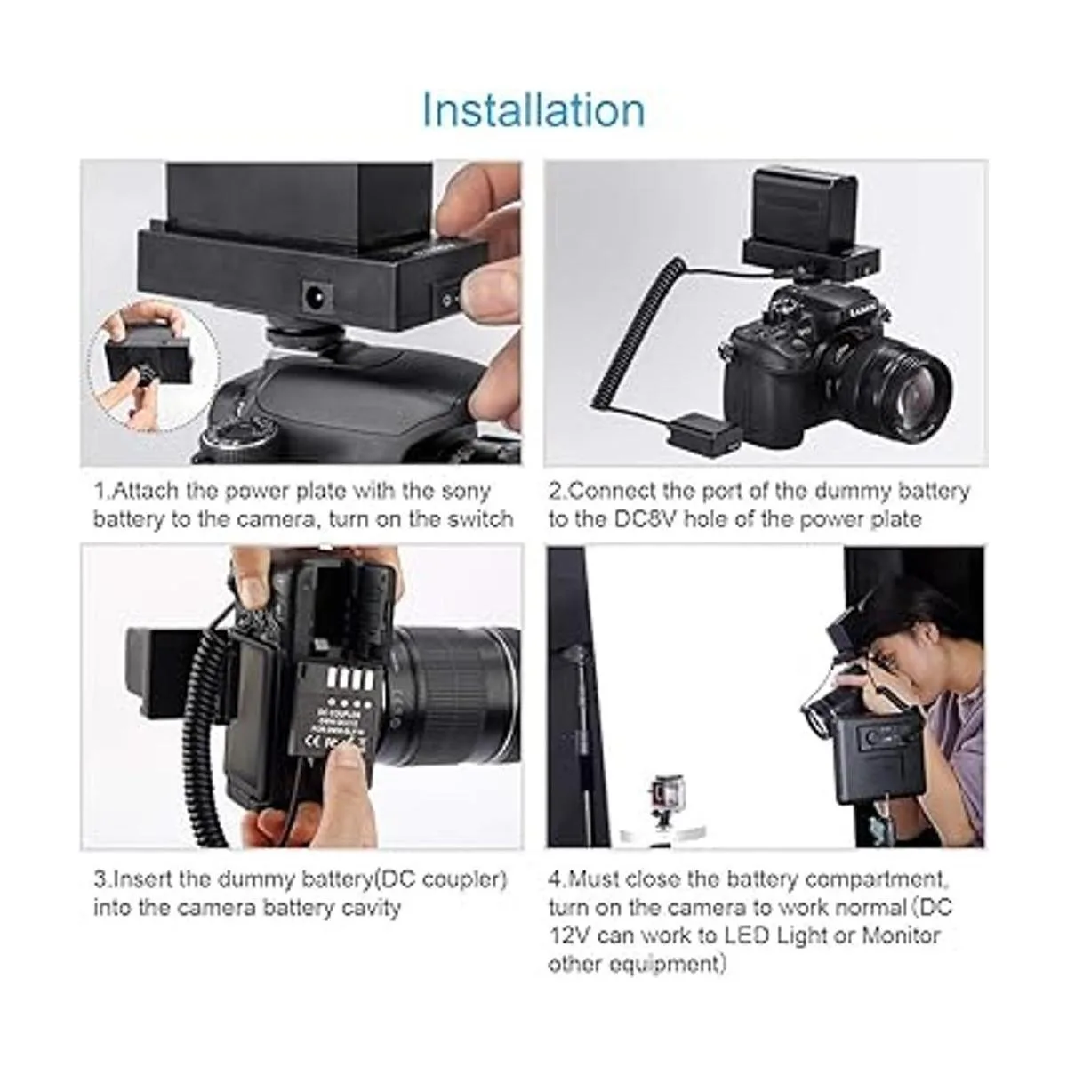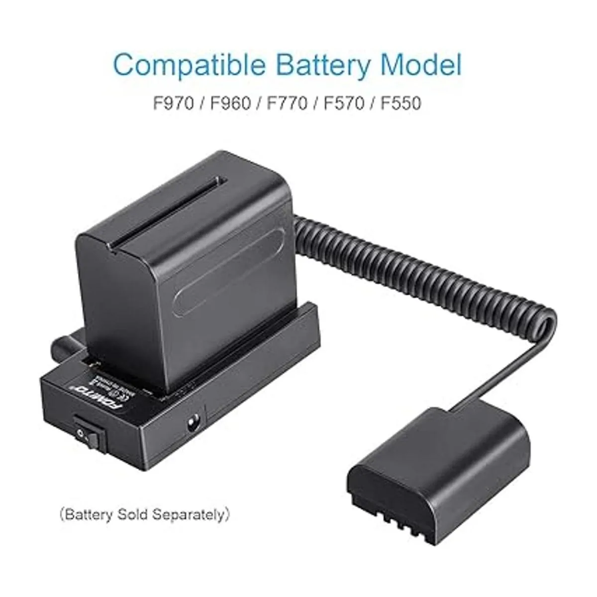 Compatible con baterías NPF970 F960 F750 F770 F550 F570, también hay salida DC 0.217 x 0.098 in 12 V/2 A, utilizando con cable en espiral macho de 8 V/12 V CC macho a macho incluido, funciona para dispositivos adicionales, como monitor de vídeo, luz LED, etc.