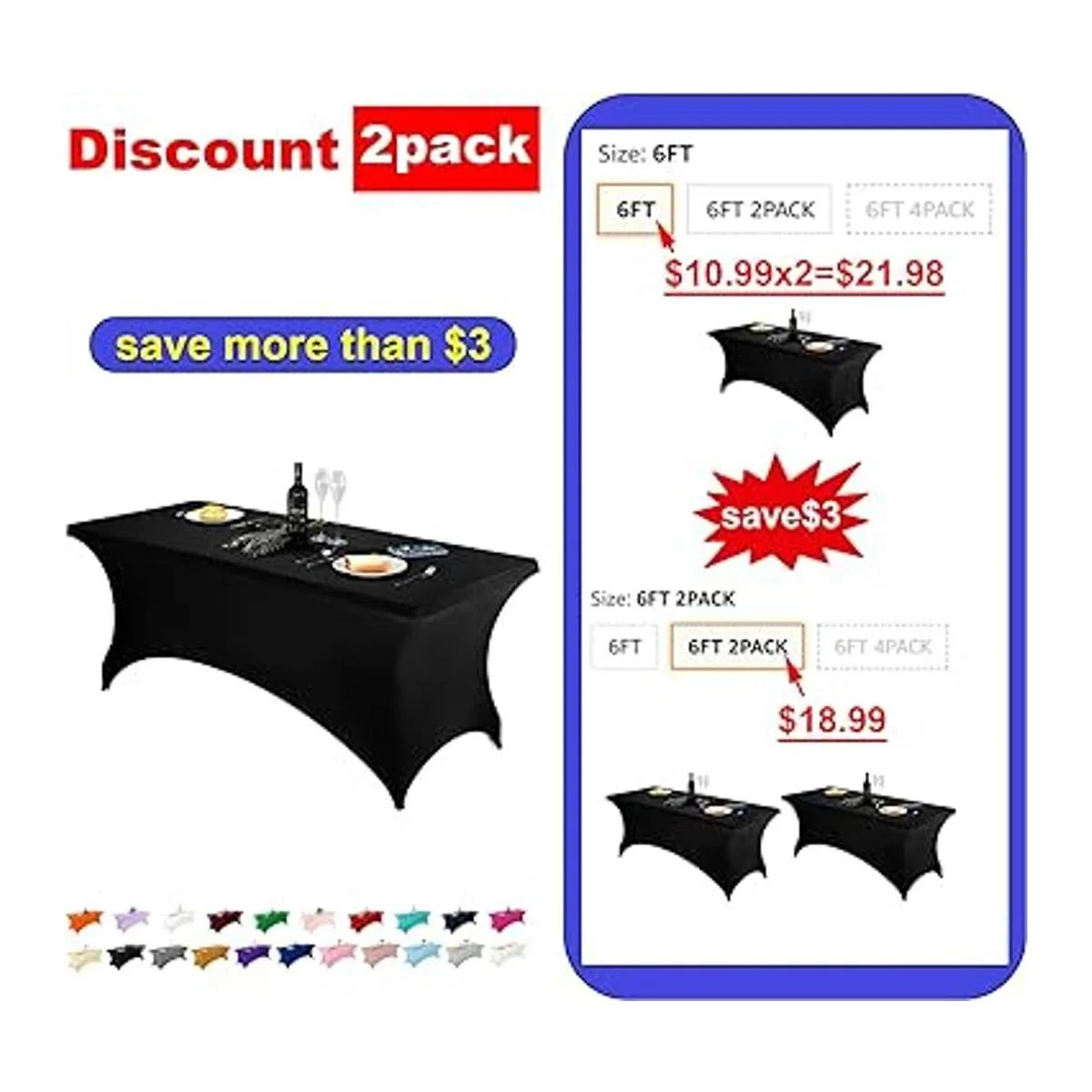 Las fundas de elastano de 6 pies se adaptan perfectamente a mesas de 72 pulgadas de largo x 30 pulgadas de ancho x 30 pulgadas de alto. Ideal para servicio de bufé, mesa de postres, banquetes, recepciones, ferias comerciales, exhibiciones de manualidades, incluso para alguna mesa de masaje o una cama de spa, etc.