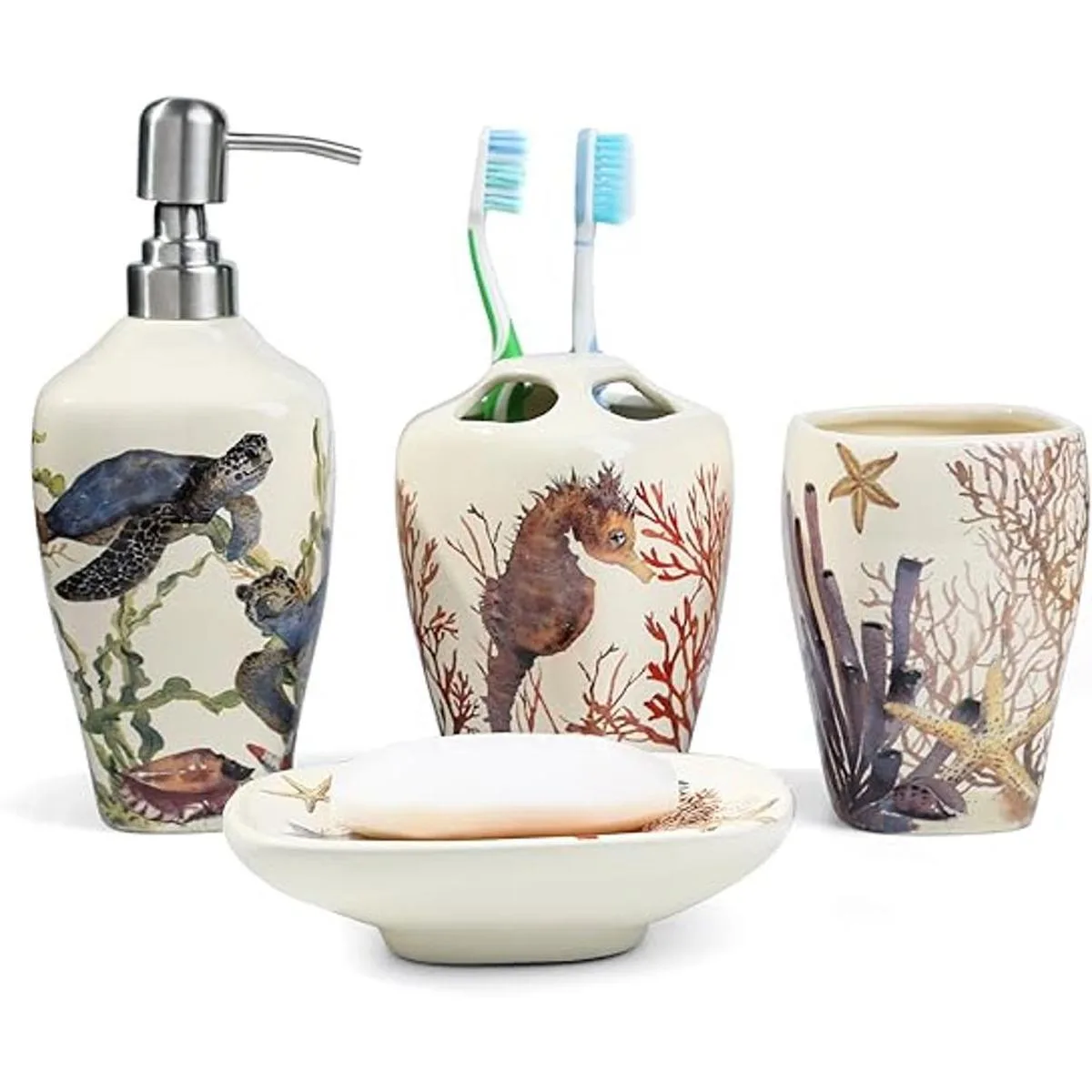 FORLONG FL3014 Juego de accesorios de baño de cerámica para tortuga marina, caballito de mar, coral, estrella de mar, 4 1 tazas para gárgaras, 1 soporte para cepillos de dientes, 1 jabonera, 1 dispensador de jabón