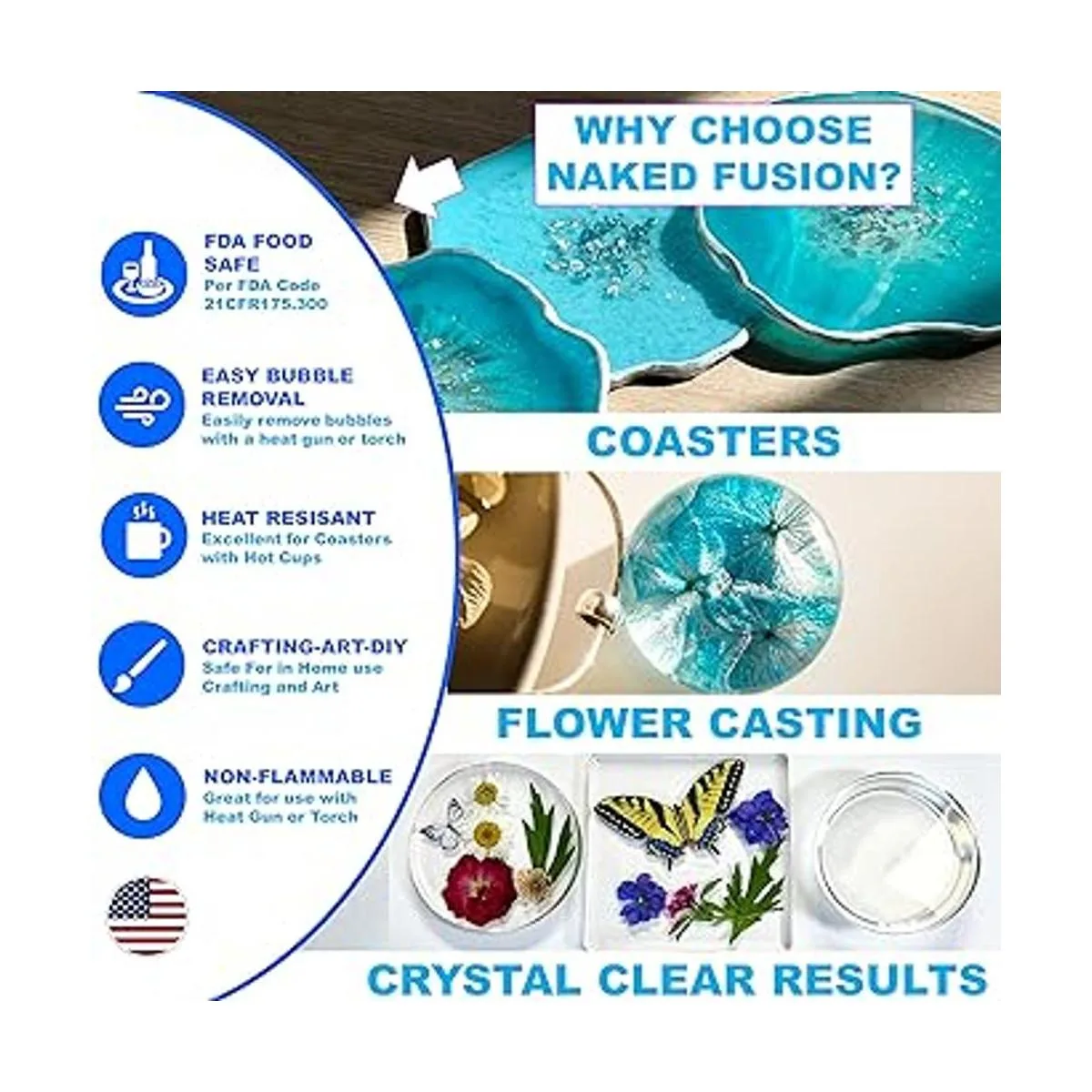 Fabricado en los Estados Unidos. Nuestros químicos de resina han estado innovando fórmulas de resina durante más de 40 años. Naked Fusion respalda nuestra resina de alta calidad. Estamos comprometidos con la satisfacción de nuestros clientes. Si no estás completamente satisfecho con nuestro kit de resina, ponte en contacto con nosotros Estamos aquí para ayudar con cualquier problema. La marca de confianza para principiantes y profesionales Lleva las manualidades a un nuevo nivel con Naked Fusion