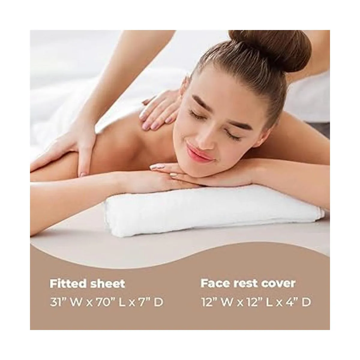Juego de sábanas de mesa de masaje: dobladillo profesional con un elástico extra firme que proporciona un ajuste apretado a todas las mesas de masaje de tamaño estándar y fundas de reposamuñecas.