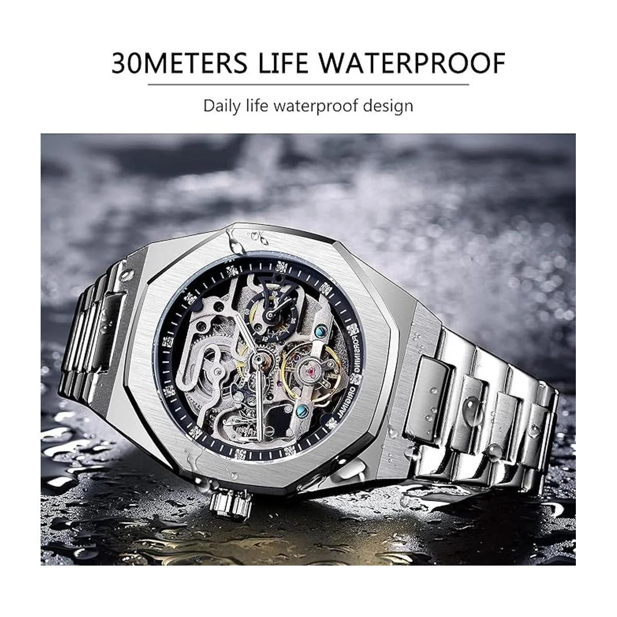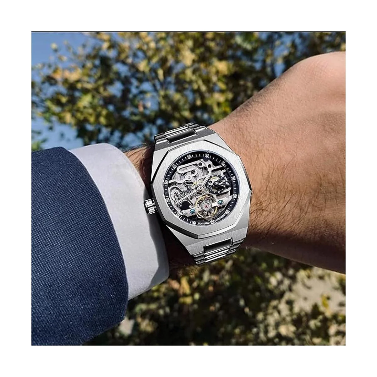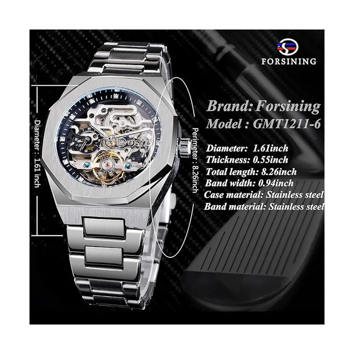 FORSINING Reloj automático de pulsera mecánico para hombre, octogonal, impermeable, reloj de esqueleto, correa de acero inoxidable plateada Tourbillon de diamantes de lujo