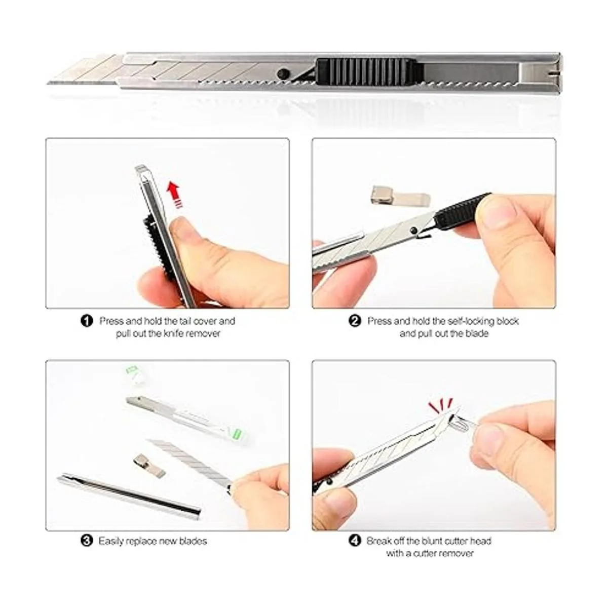 El juego de cuchillos retráctiles incluye 3 cuchillos de corte y 30 piezas adicionales de acero al carbono de 30 grados de 0.354 in.