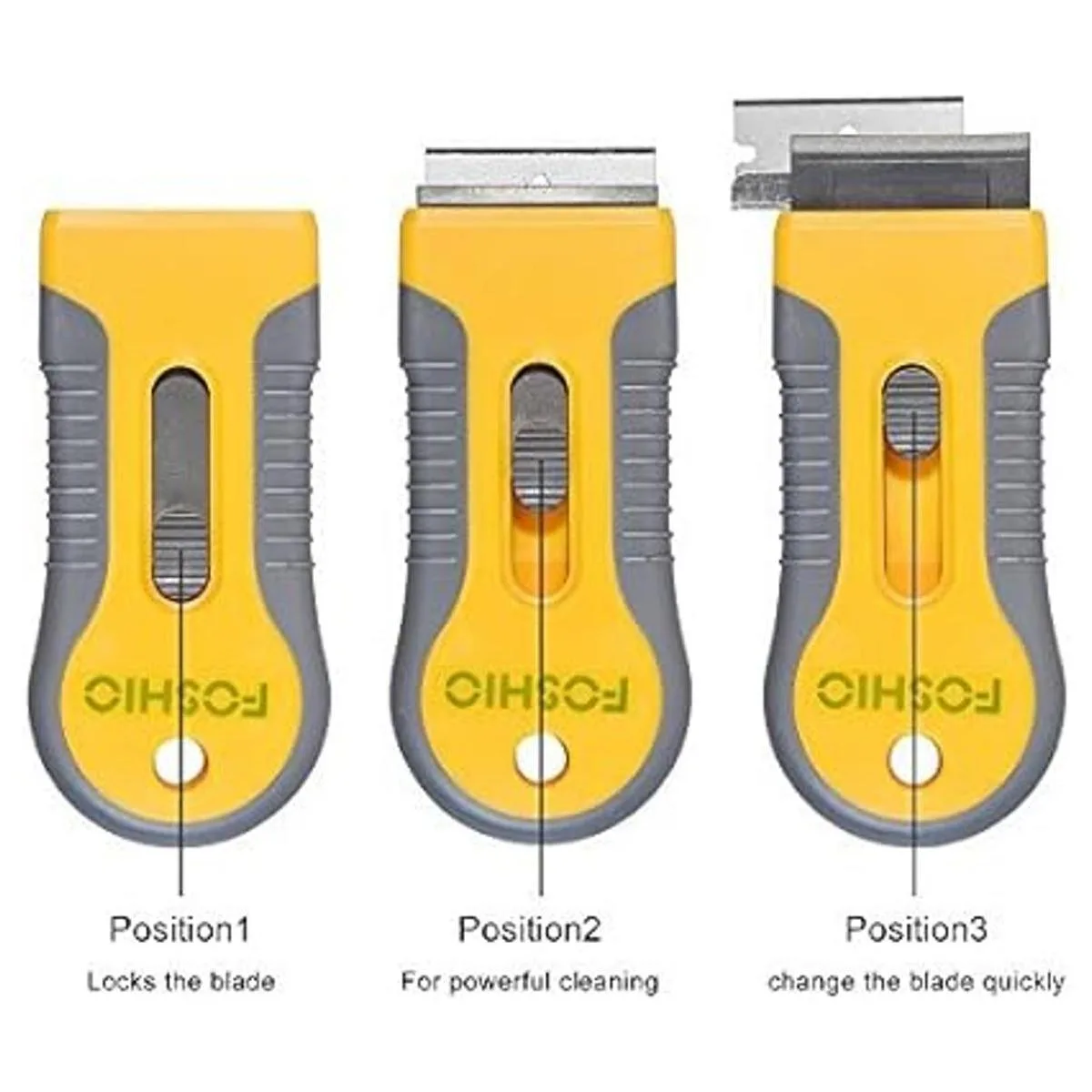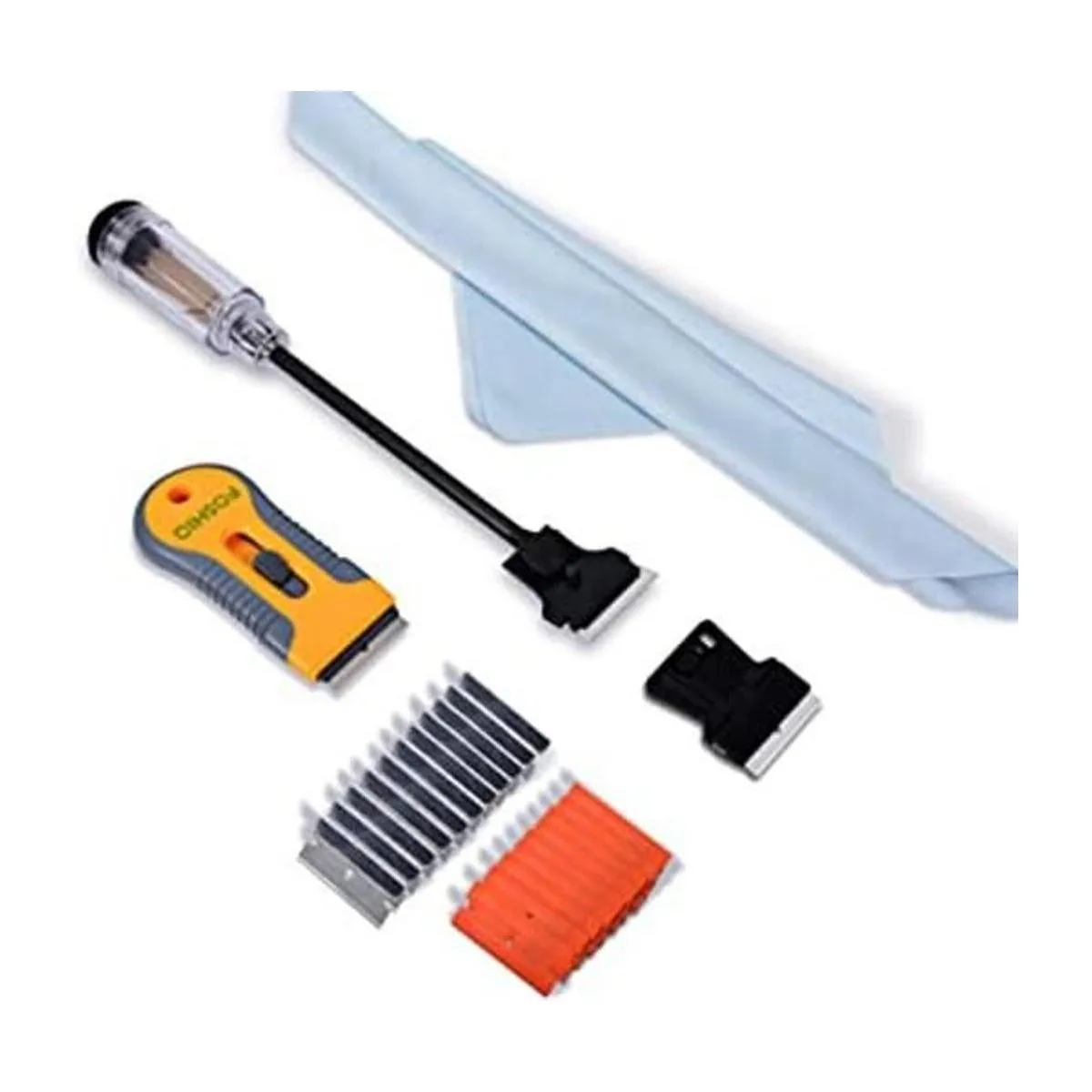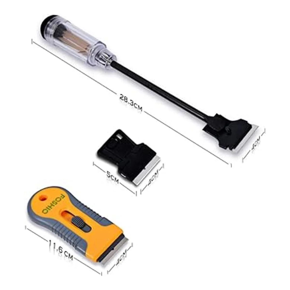 Incluye rascador de hoja de afeitar de mango de largo alcance, rascador de vidrio retráctil, mini rascador de afeitar negro, cuchillas de afeitar de plástico, cuchillas de afeitar de acero al carbono y colth de limpieza micro suave