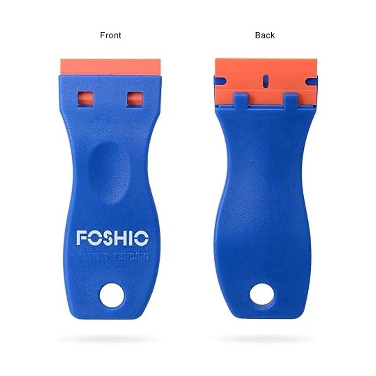 FOSHIO Raspador con cuchillas plásticas para remover juntas, adhesivos, sellos y etiquetas en ventanas y vidrio, incluye 2 raspadores y 100 cuchillas de plástico