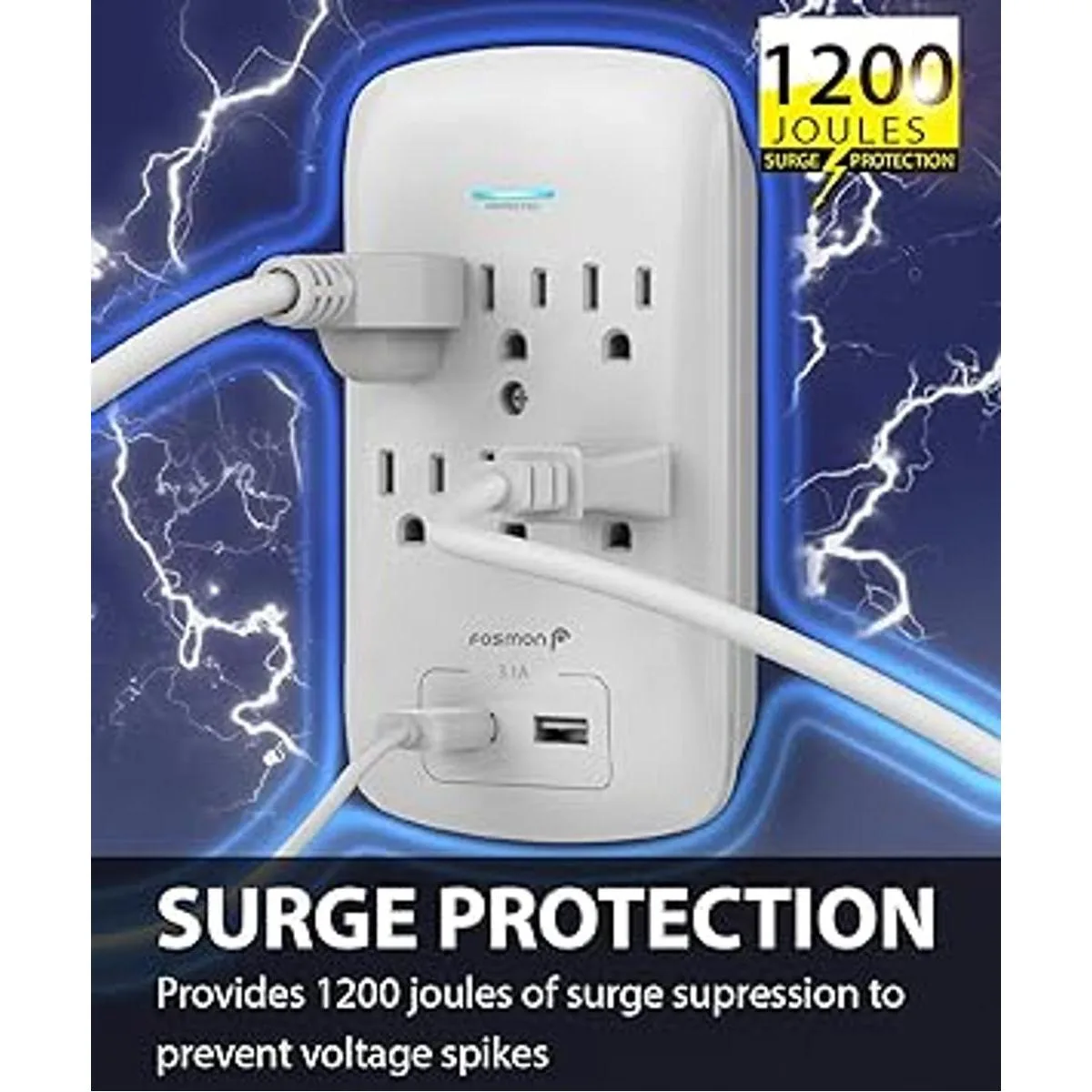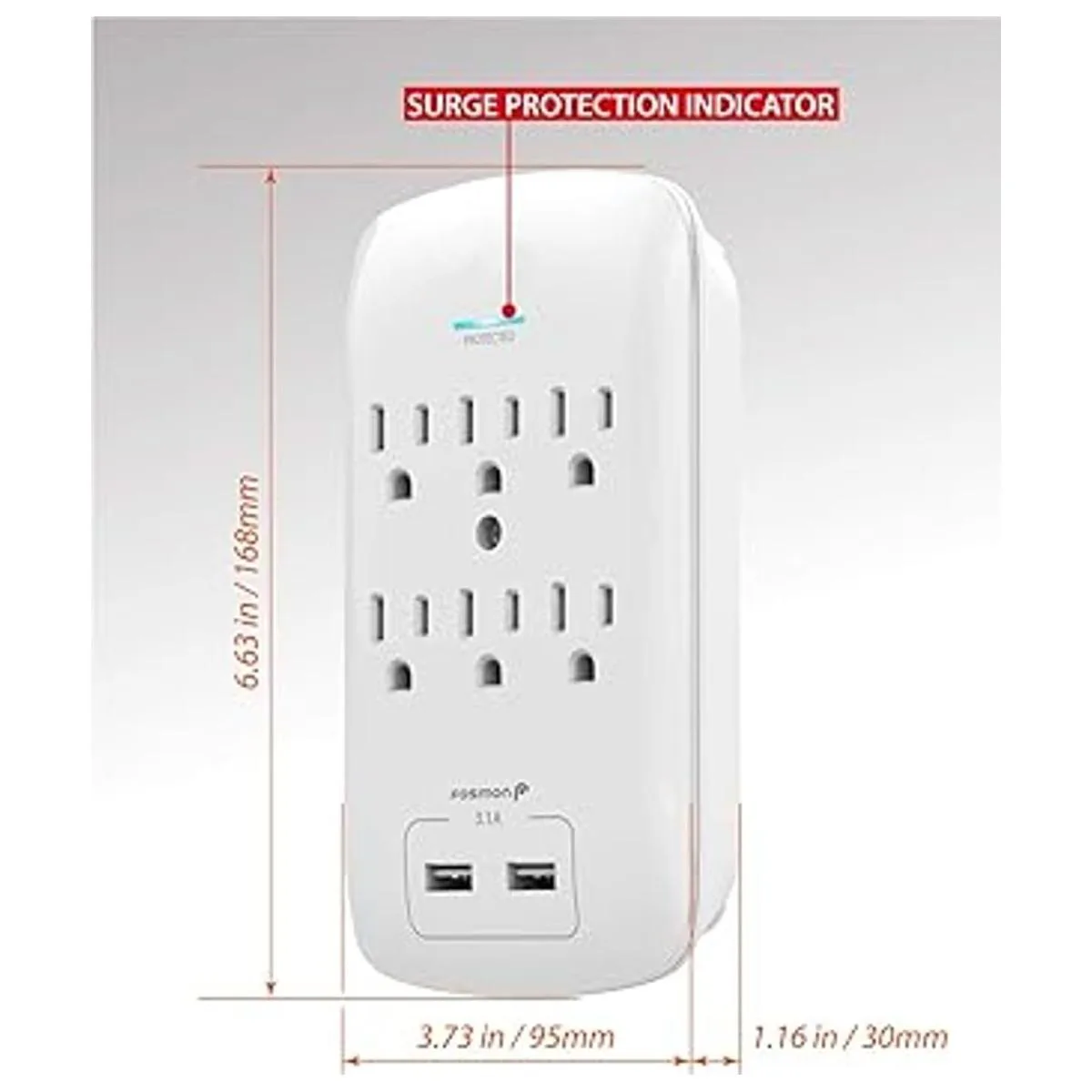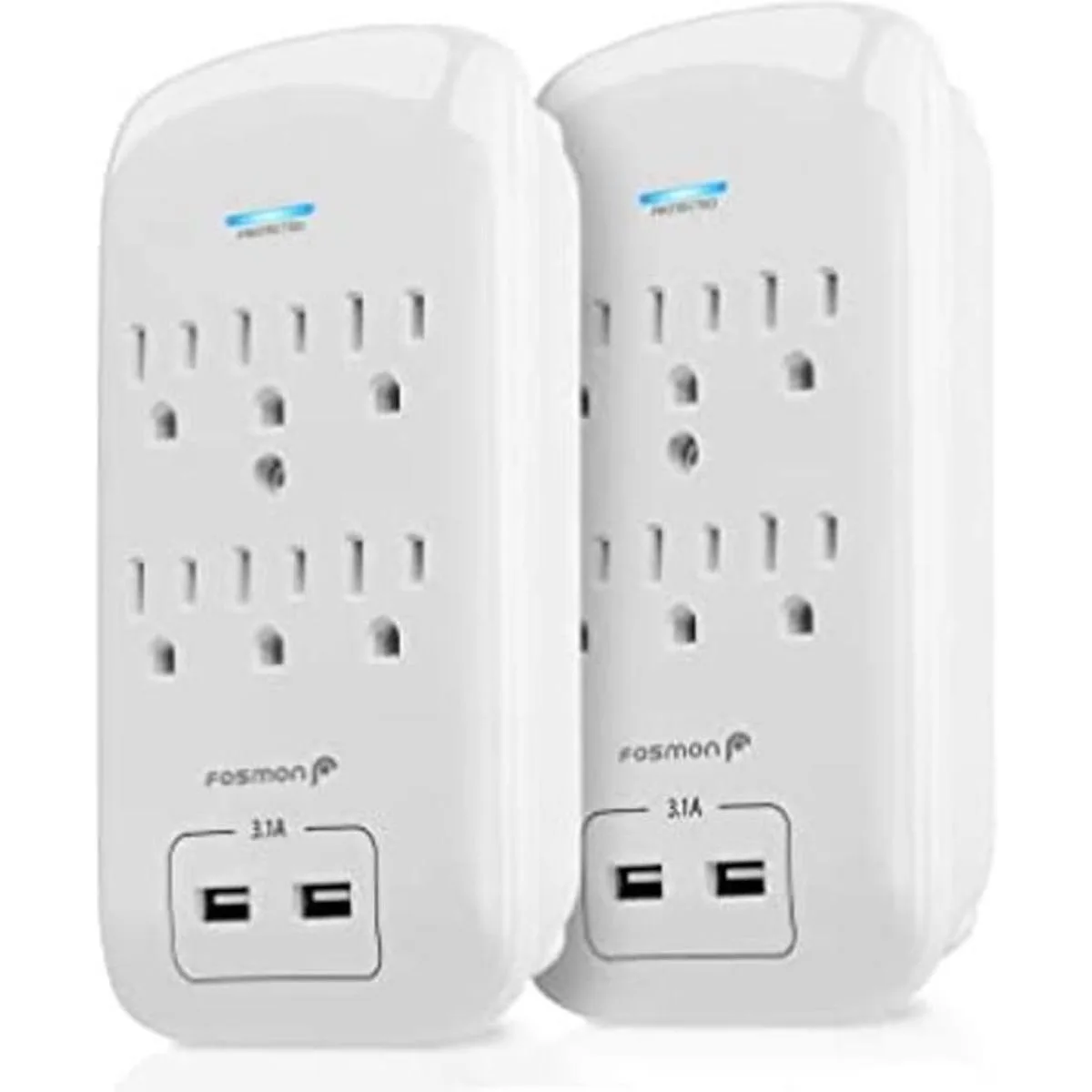 Fosmon Protector contra sobretensiones de 6 salidas 1200 J, 2 unidades con cargador de puertos USB dual de 3,1 A, extensor de enchufe múltiple de 1875 vatios, adaptador divisor de 3 puntas de pared