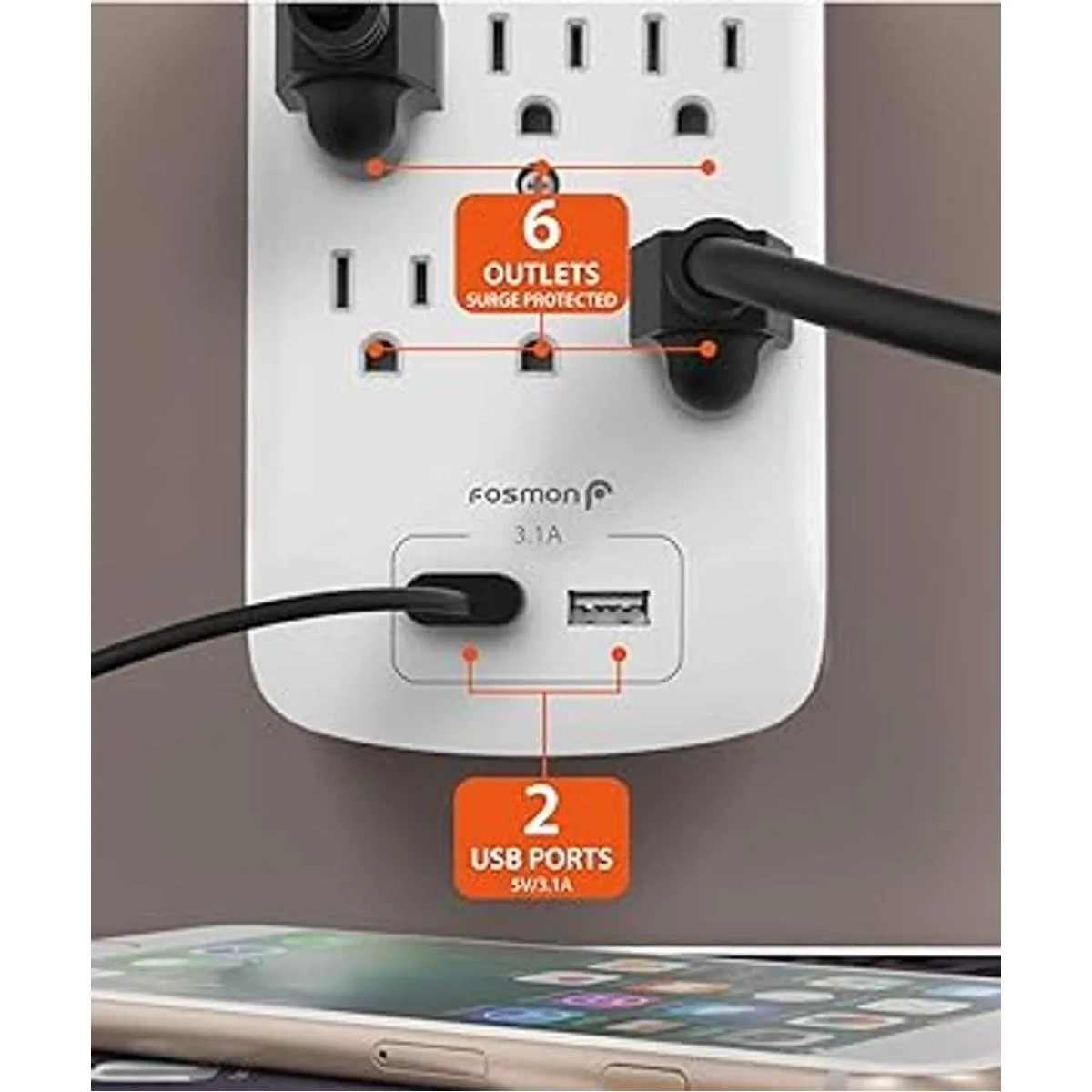 Fosmon Protector contra sobretensiones de 6 salidas (1200 J, 2 unidades) con cargador de puertos USB dual de 3,1 A, extensor de enchufe múltiple de 1875 vatios, adaptador divisor de 3 puntas de pared