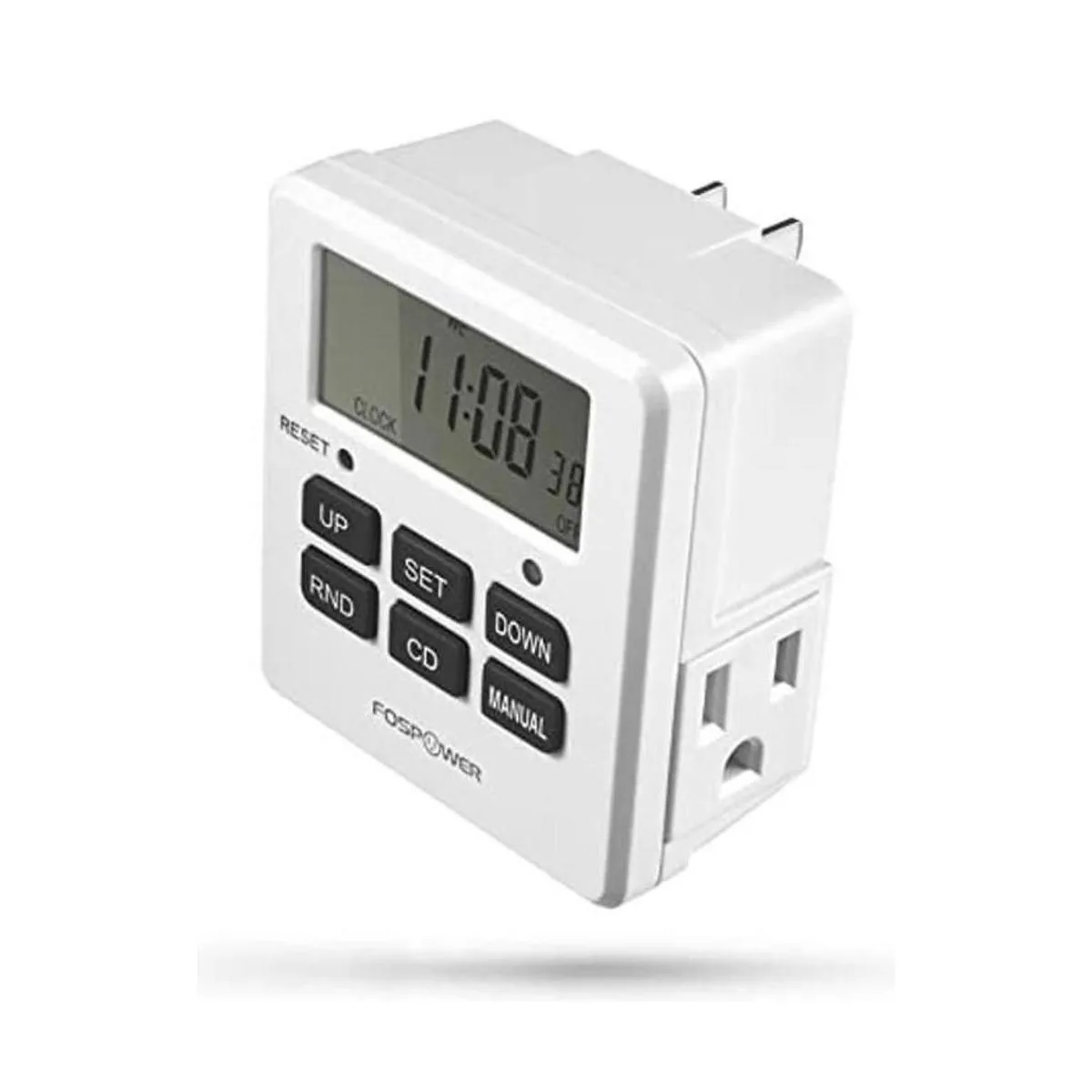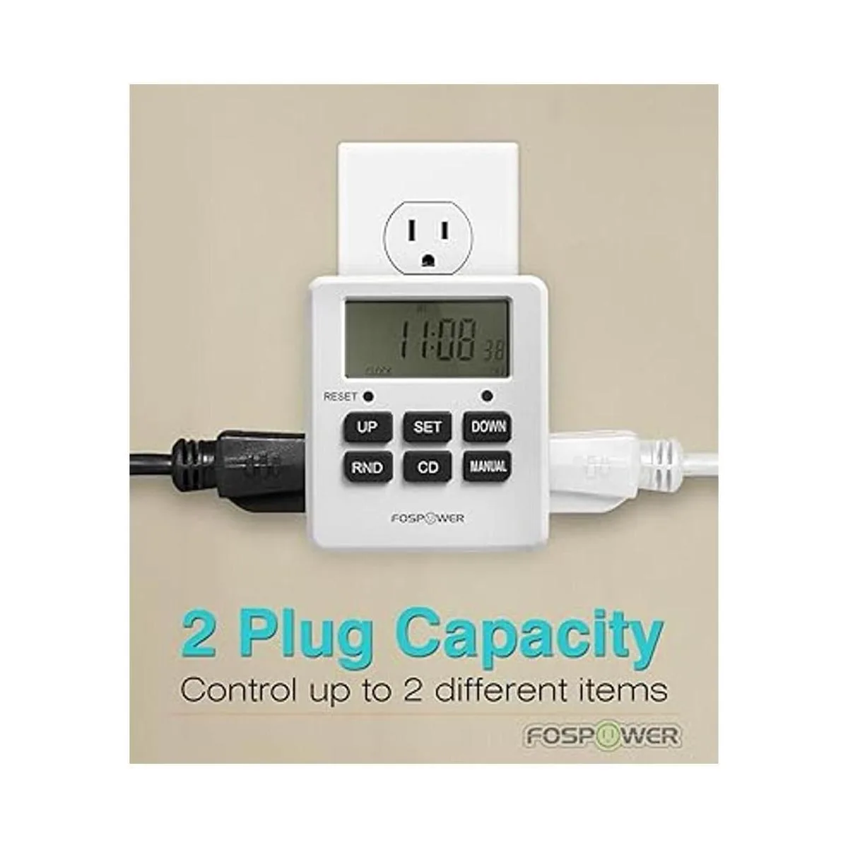 FosPower Temporizador de salida 125 V15 A, LCD, temporizador programable de 7 días con 2 conectores de CA para luces, lámparas, ventiladores y tomas de corriente eléctrica